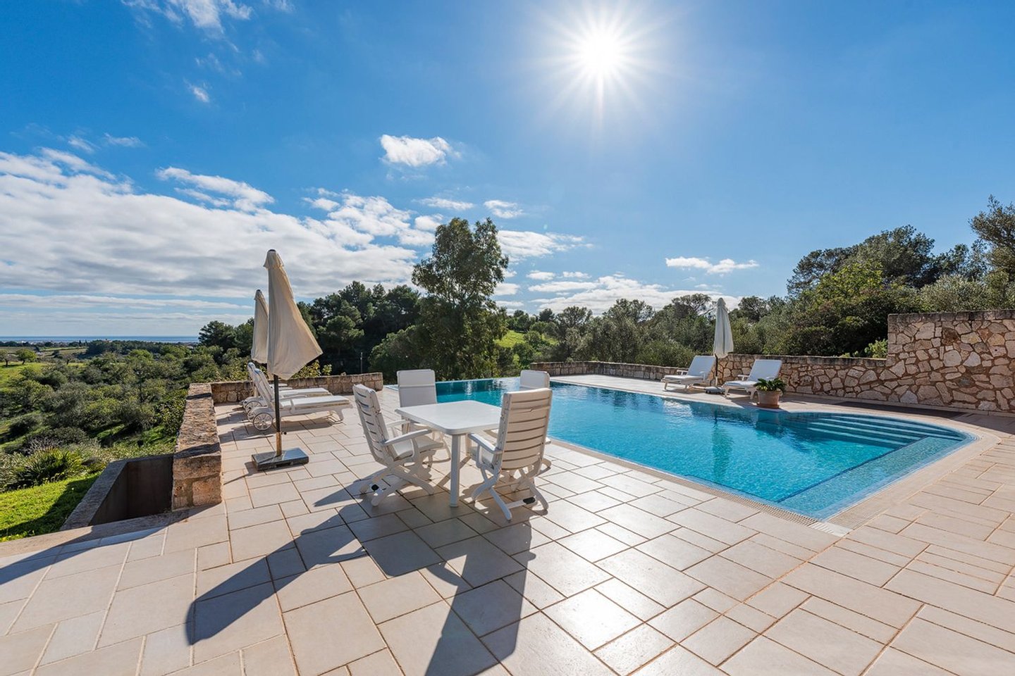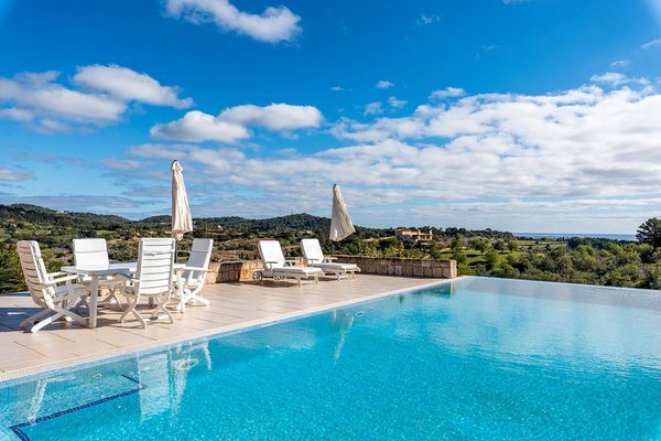 Der Infinitypool mit Meerblick, die weitläufige Sonnenterrasse und der mediterrane Garten verschmelzen harmonisch mit der Umgebung – wie ein Rückzugsort in der mallorquinischen Toskana.