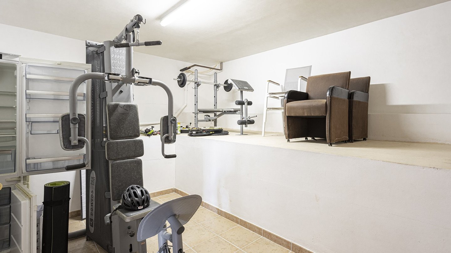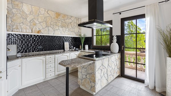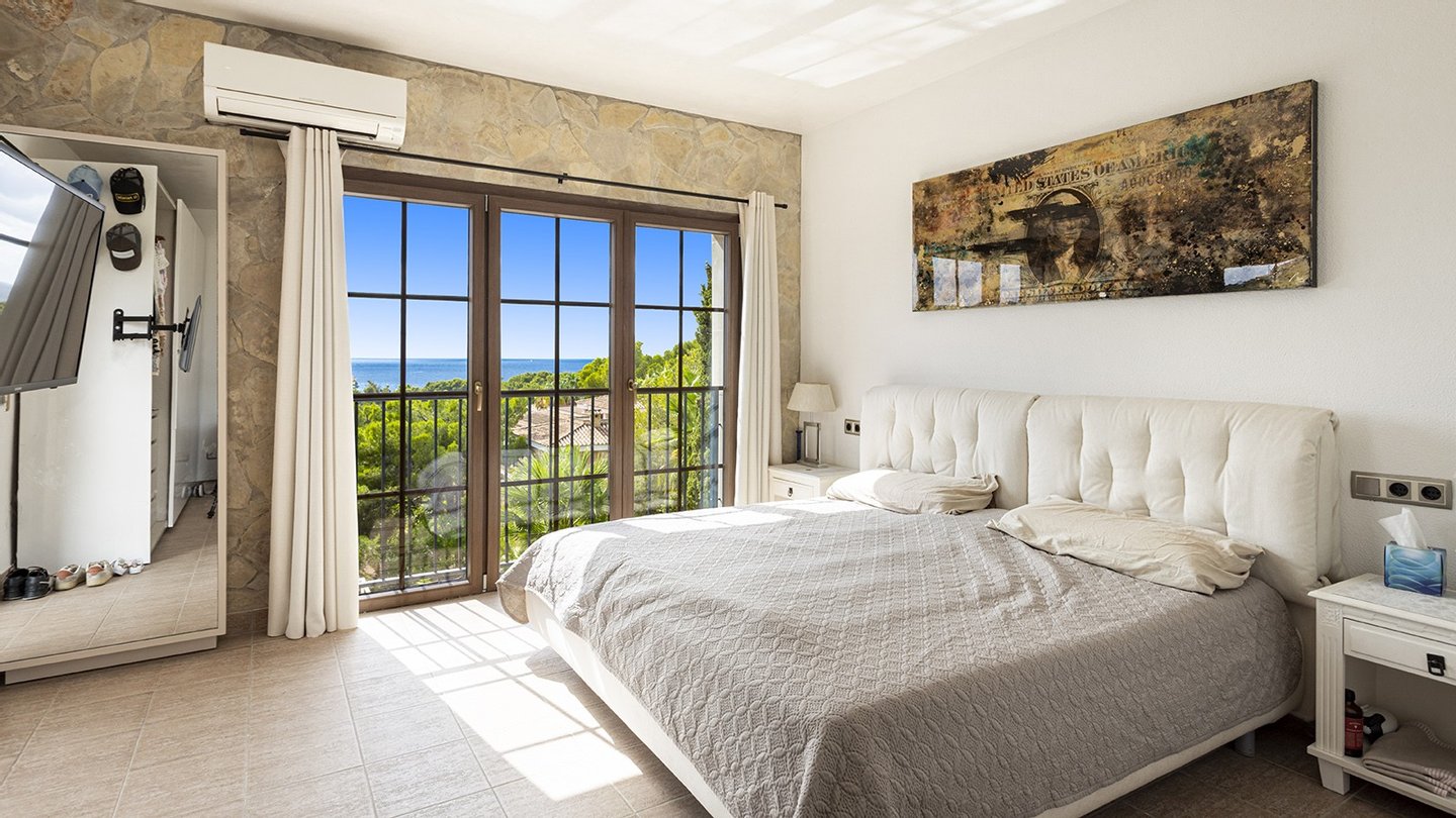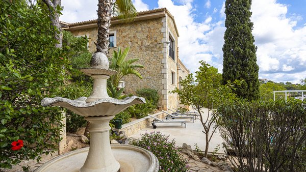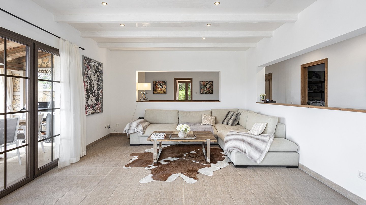 Die Immobilie verfügt über insgesamt vier großzügige Schlafzimmer und vier moderne Badezimmer, die hohen Wohnkomfort gewährleisten - ideal für Familien oder Gäste. Praktische Einbauschränke bieten viel Stauraum und unterstreichen die durchdachte Raumaufteilung. Zusätzliche Nutzflächen wie ein Abstellraum und ein Kellerraum schaffen weitere Ordnungsmöglichkeiten. Traditionelle Holzbalkendecken verleihen dem Haus mallorquinischen Charme und eine behagliche Atmosphäre. Für ein angenehmes Raumklima zu jeder Jahreszeit sorgen Fußbodenheizung, Klimaanlage sowie eine Ölzentralheizung  ? perfekt abgestimmt auf moderne Wohnansprüche. Der Außenbereich dieser Immobilie ist ebenso beeindruckend wie das Innere: Ein liebevoll angelegter Garten mit automatischer Bewässerung und stimmungsvoller Beleuchtung schafft eine Oase der Ruhe und Erholung. Ein integrierter BBQ-Bereich lädt zu geselligen Abenden unter freiem Himmel ein. Der private Pool mit ca. 30?m² bietet an warmen Tagen willkommene Abkühlung - mit herrlichem Weitblick bis zum Meer. Für Fahrzeuge stehen ein Garagenstellplatz sowie drei zusätzliche PKW-Stellplätze zur Verfügung. Ein elektrisches Garagentor sowie ein automatisches Zufahrtstor sorgen dabei für Komfort und Sicherheit.