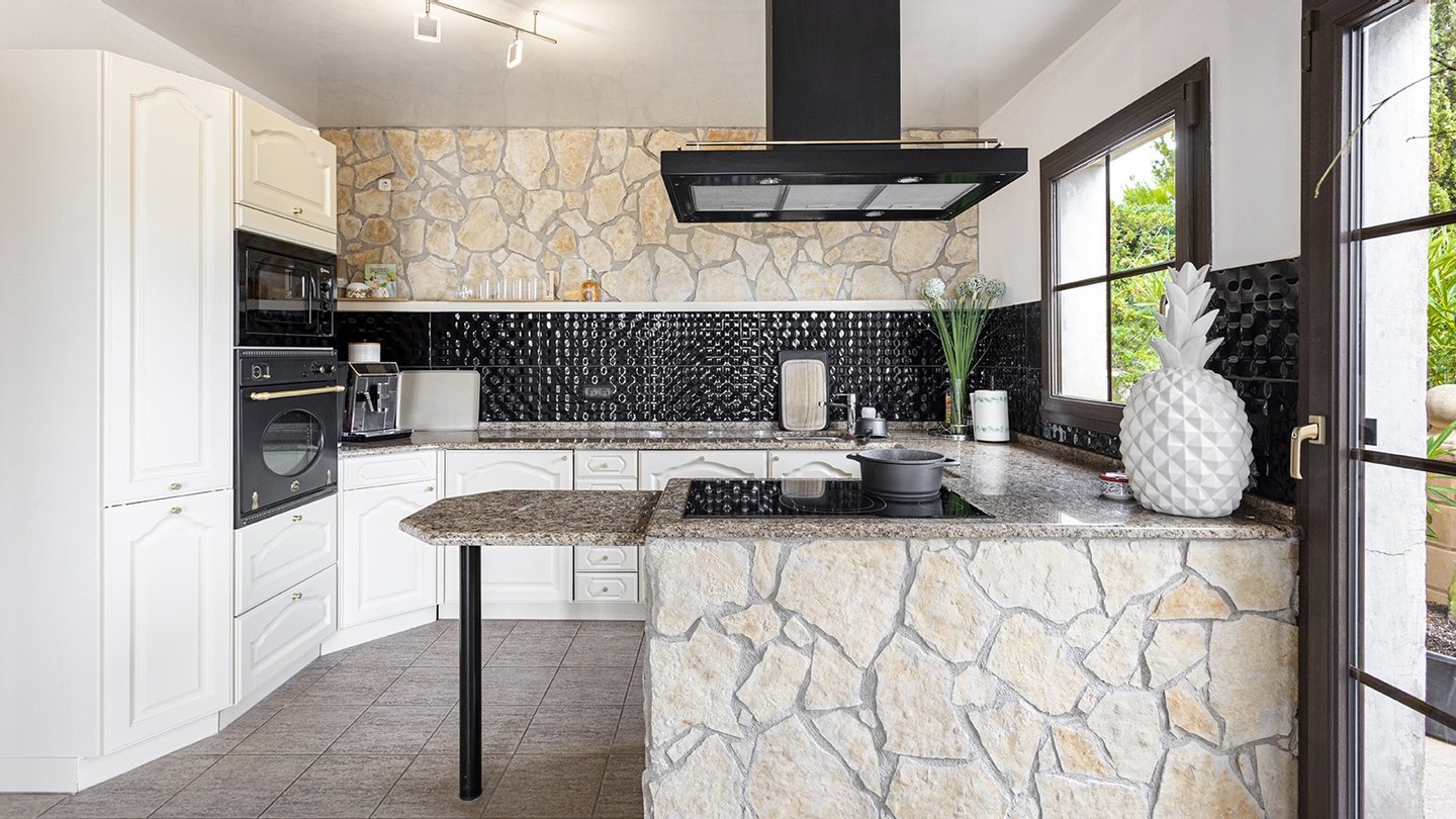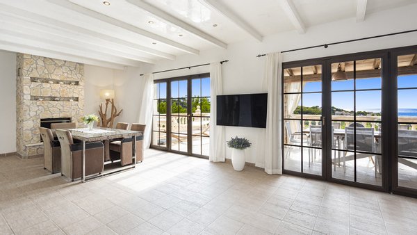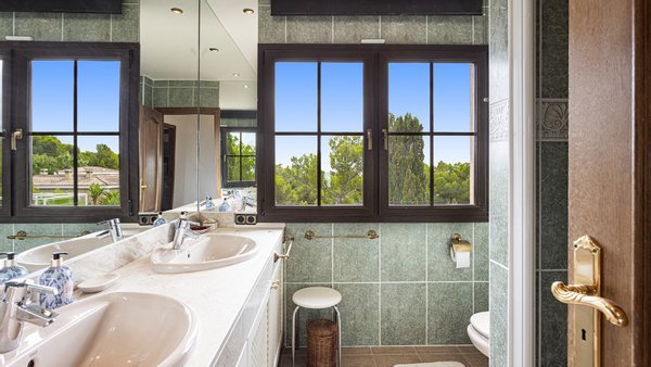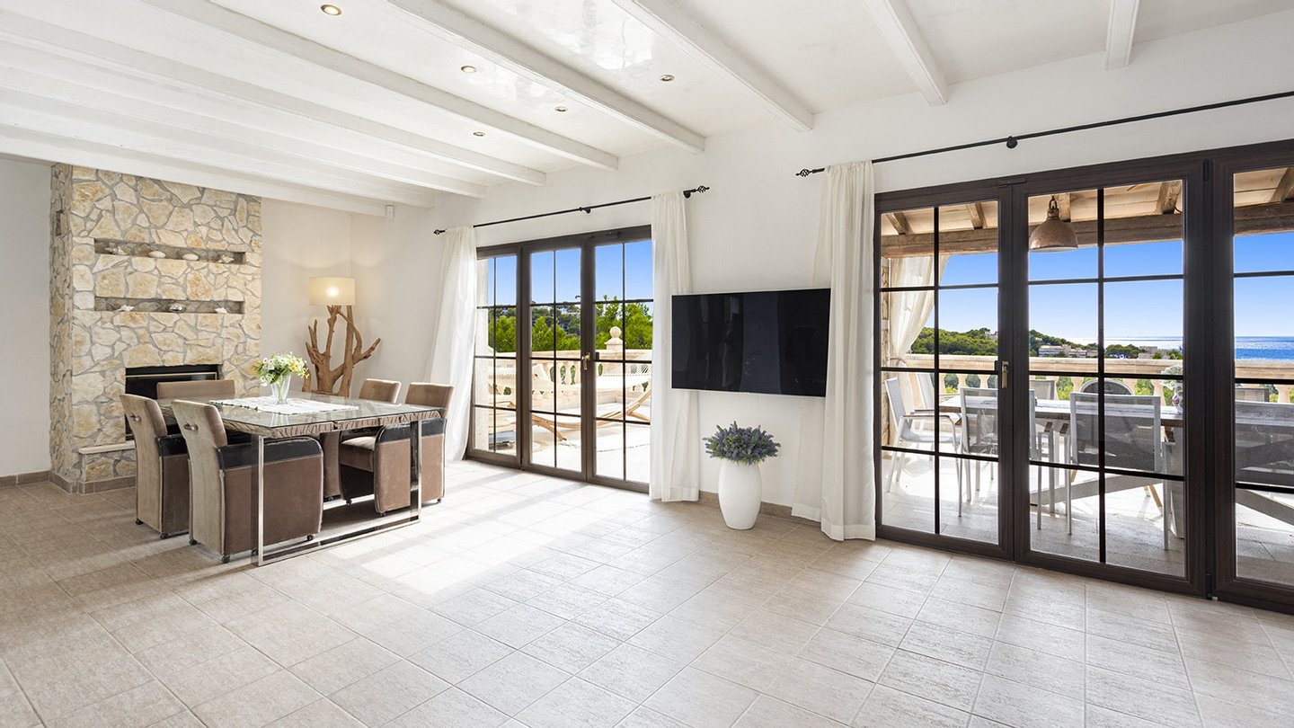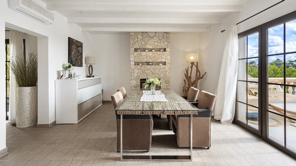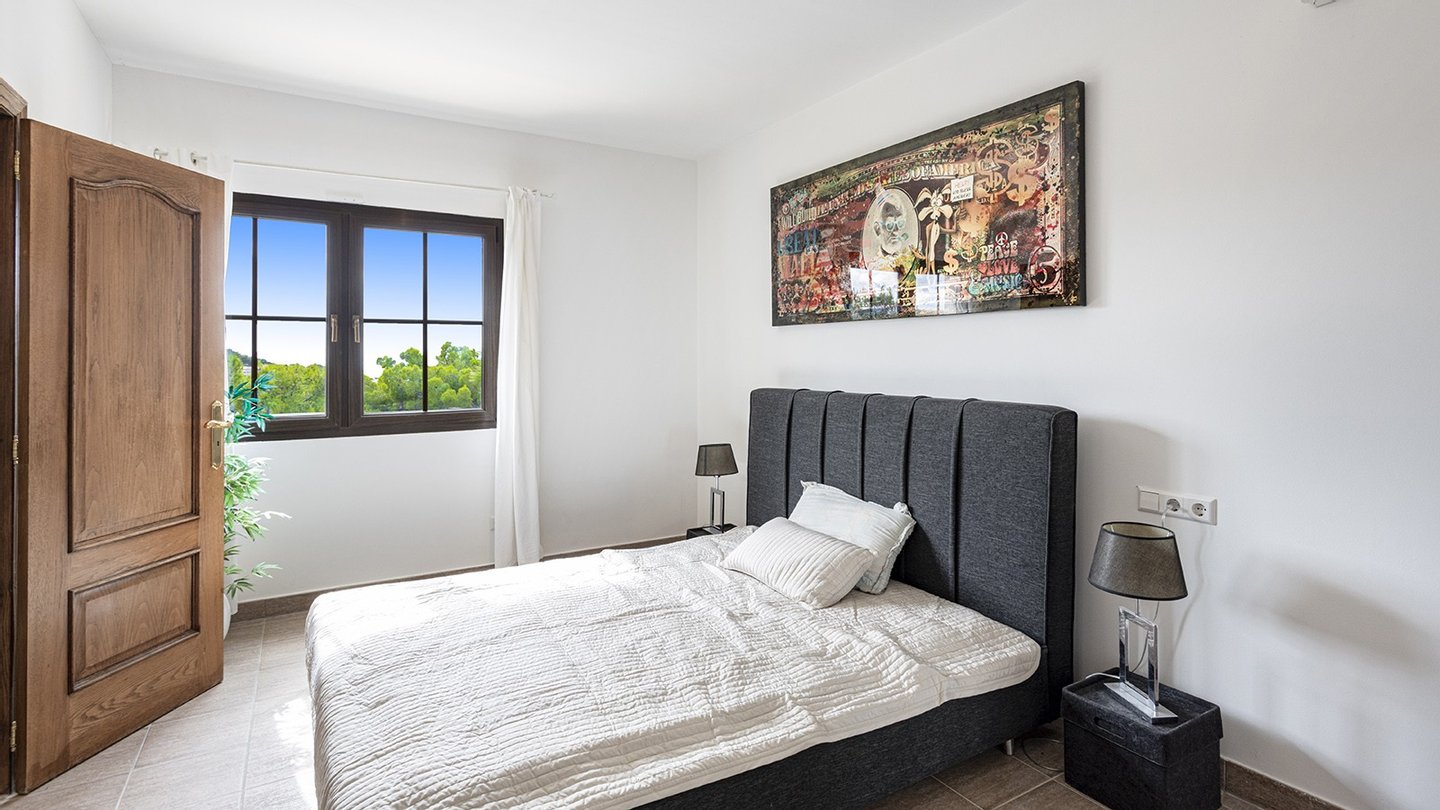 Die Immobilie verfügt über insgesamt vier großzügige Schlafzimmer und vier moderne Badezimmer, die hohen Wohnkomfort gewährleisten - ideal für Familien oder Gäste. Praktische Einbauschränke bieten viel Stauraum und unterstreichen die durchdachte Raumaufteilung. Zusätzliche Nutzflächen wie ein Abstellraum und ein Kellerraum schaffen weitere Ordnungsmöglichkeiten. Traditionelle Holzbalkendecken verleihen dem Haus mallorquinischen Charme und eine behagliche Atmosphäre. Für ein angenehmes Raumklima zu jeder Jahreszeit sorgen Fußbodenheizung, Klimaanlage sowie eine Ölzentralheizung  ? perfekt abgestimmt auf moderne Wohnansprüche. Der Außenbereich dieser Immobilie ist ebenso beeindruckend wie das Innere: Ein liebevoll angelegter Garten mit automatischer Bewässerung und stimmungsvoller Beleuchtung schafft eine Oase der Ruhe und Erholung. Ein integrierter BBQ-Bereich lädt zu geselligen Abenden unter freiem Himmel ein. Der private Pool mit ca. 30?m² bietet an warmen Tagen willkommene Abkühlung - mit herrlichem Weitblick bis zum Meer. Für Fahrzeuge stehen ein Garagenstellplatz sowie drei zusätzliche PKW-Stellplätze zur Verfügung. Ein elektrisches Garagentor sowie ein automatisches Zufahrtstor sorgen dabei für Komfort und Sicherheit.