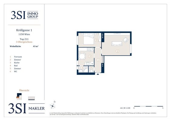 Die Wohnfläche von rund 43 m² überzeugt durch einen effizienten und gut durchdachten Grundriss, der sowohl Funktionalität als auch Wohnkomfort bietet. Die Raumaufteilung gestaltet sich wie folgt: