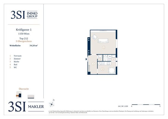 Die Wohnfläche von rund 34 m² überzeugt durch einen effizienten und gut durchdachten Grundriss, der sowohl Funktionalität als auch Wohnkomfort bietet. Die Raumaufteilung gestaltet sich wie folgt: