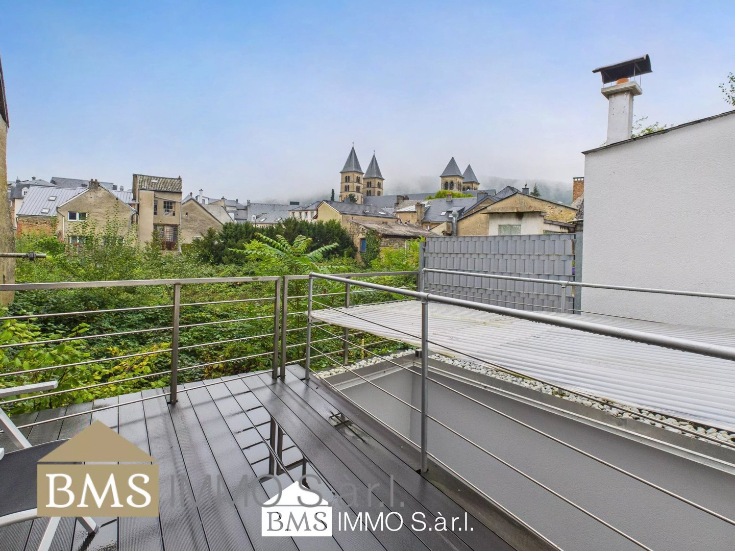 Zusätzlich gibt es eine Außenterrasse im ersten Obergeschoss mit Blick auf die historische Abtei von Echternach.