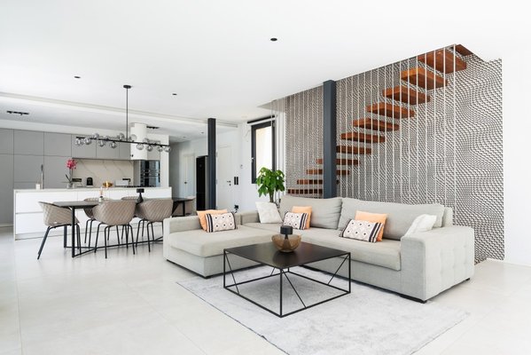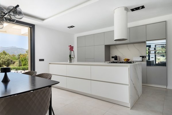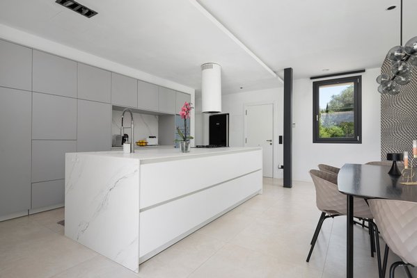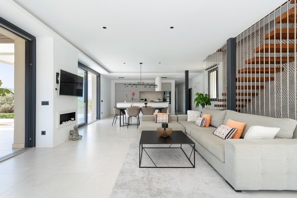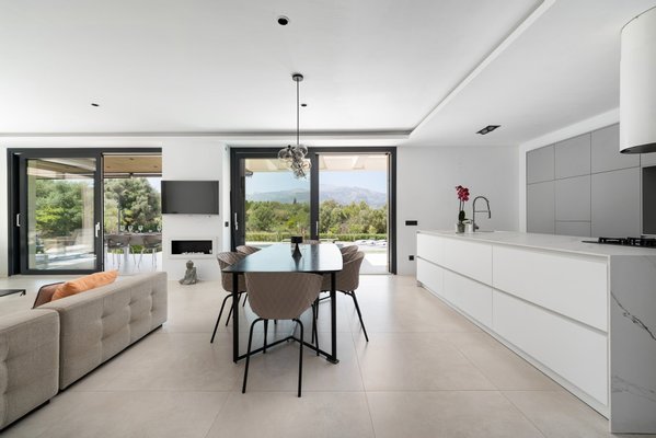 Die Innenräume sind mit viel Liebe zum Detail und hochwertigen Materialien gestaltet. Die Küche wurde von einem renommierten Designstudio entworfen, ist voll ausgestattet und verfügt über eine zentrale Kochinsel. Der offene Wohn- und Essbereich ist hell und geräumig, mit einem Gaskamin und großen Schiebetüren, die direkt in den Garten und zum Pool führen.