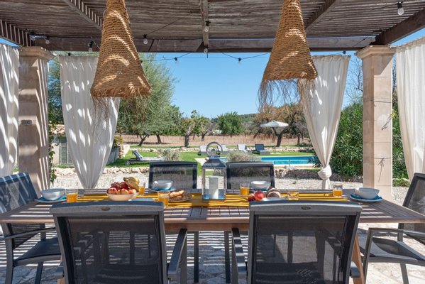Im Außenbereich ist der Garten mit mediterranen Pflanzen und Bäumen bepflanzt. Ein Swimmingpool und eine überdachte Terrasse bieten den perfekten Ort zum Entspannen oder für Unterhaltung im Freien.