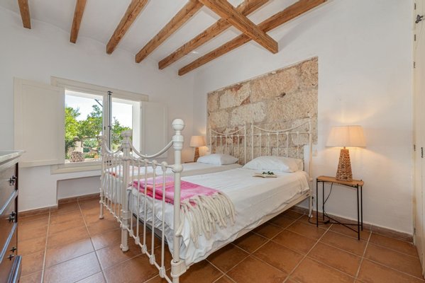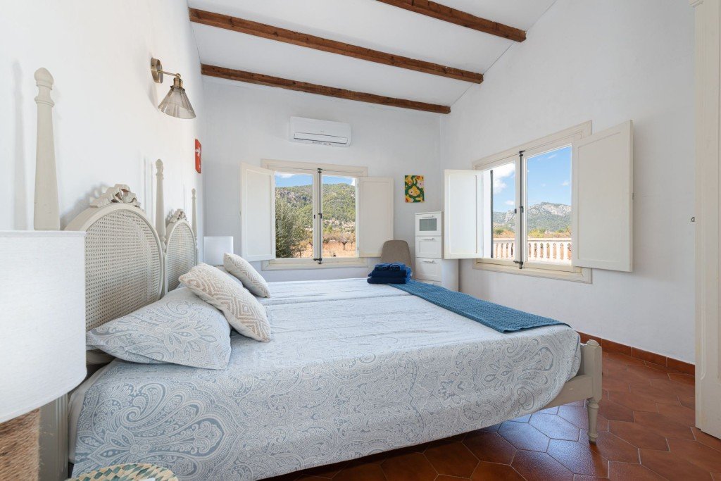 Im Obergeschoss befinden sich vier geräumige Schlafzimmer, alle mit eigenem Bad. Ein heller Sitzbereich bietet einen weiteren komfortablen Wohnraum, während zwei Schlafzimmer und das Wohnzimmer auf eine große Terrasse mit Blick über die Landschaft und das Tramuntana-Gebirge führen.