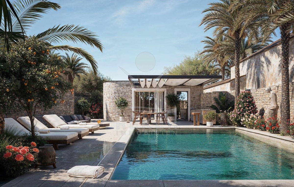 Der Außenbereich fühlt sich wie eine eigene kleine Welt an. Umgeben von hohen Steinmauern und gewachsenem Grün, bleibt das Grundstück komplett uneinsehbar. Zwischen alten Palmen, Olivenbäumen und blühenden Sträuchern liegt der Pool – mit viel Platz zum Entspannen, Essen, Leben. Daneben: das 40 m² große Poolhaus mit überdachter Lounge, Außenküche und Duschbad. Der Garten ist strukturiert, großzügig, gepflegt – und trotzdem ganz natürlich. Wege aus Naturstein, eine Wasserstelle, eine Feuerstelle. Viel Platz, viele Ecken, viel Atmosphäre.