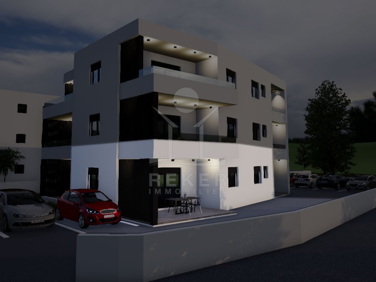 Vodice, ein ruhiges Wohnviertel, rund 700 Meter vom Zentrum entfernt. Auch zum Strand sind es nur wenige Gehminuten. Die Umgebung ist grün, locker bebaut und angenehm still. Das Gebäude wirkt modern, klar, aufgeräumt. Drei Etagen, sechs Wohnungen. Pro Stockwerk zwei Einheiten. Die Fertigstellung ist für Sommer 2026 geplant. Dann ziehen Sie schlüsselfertig ein. Vor dem Haus: ein Parkplatz pro Wohnung.