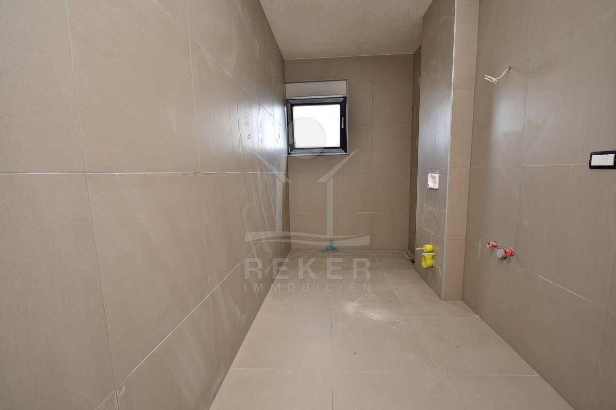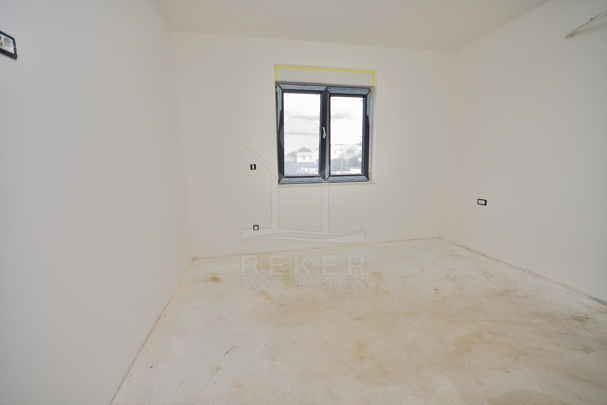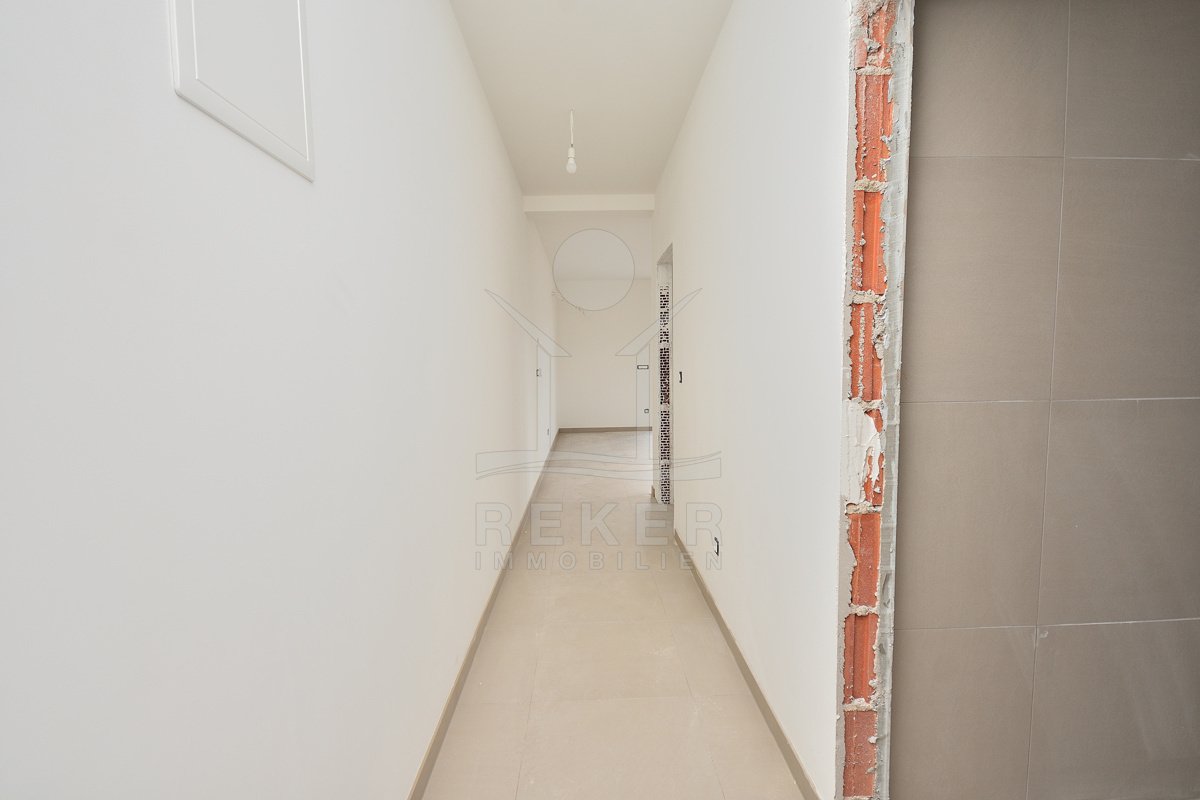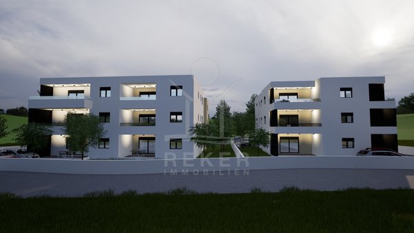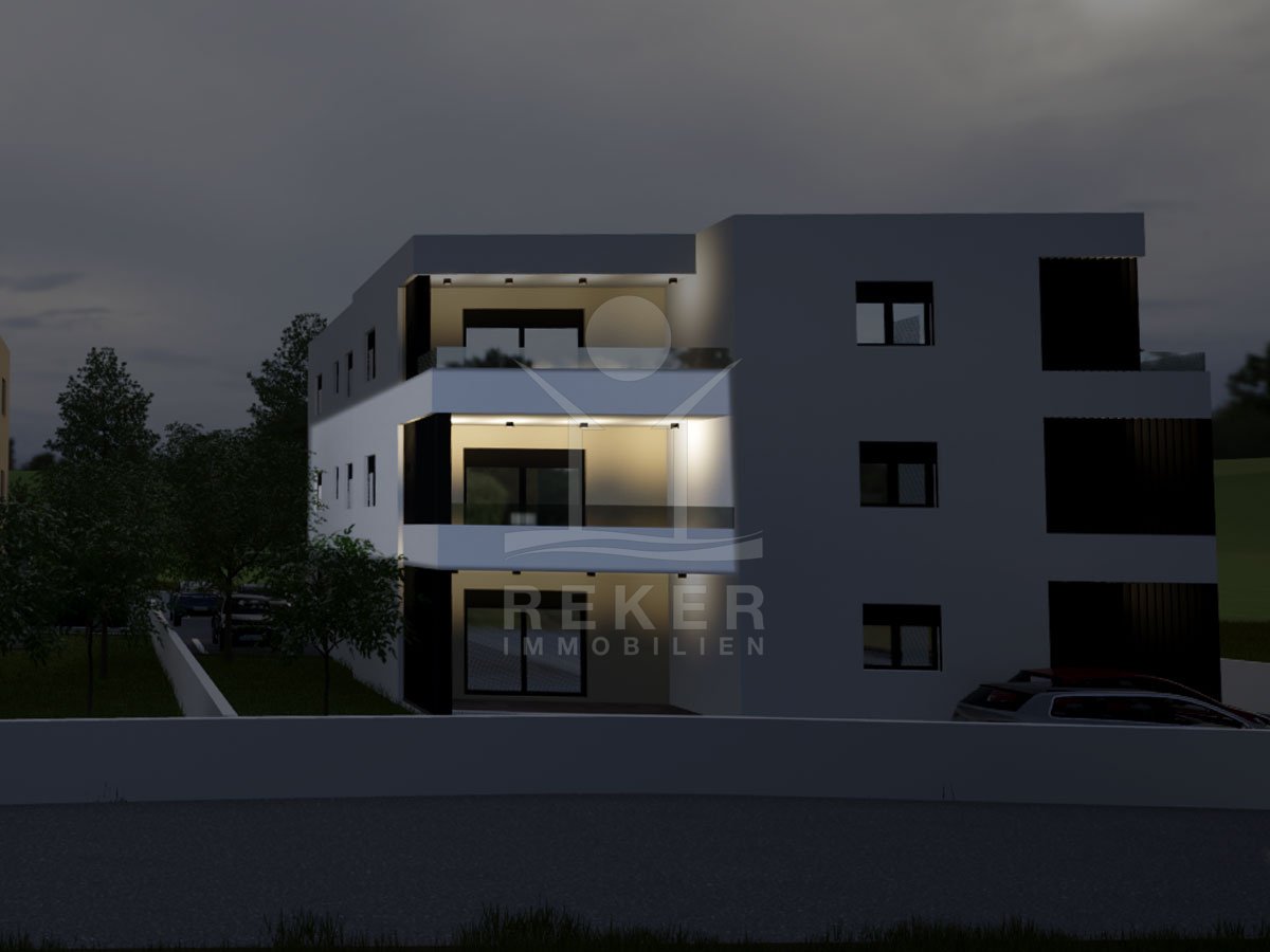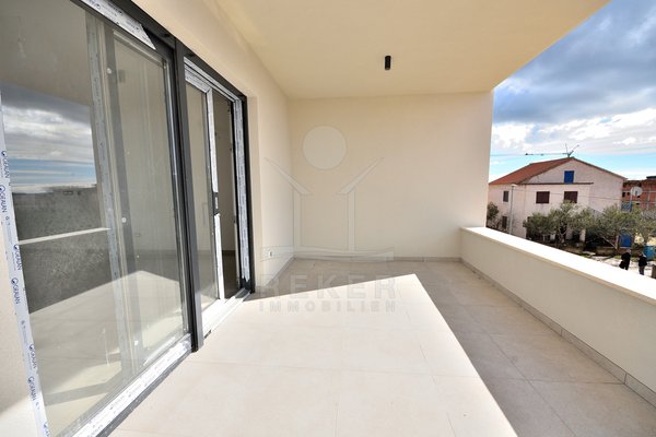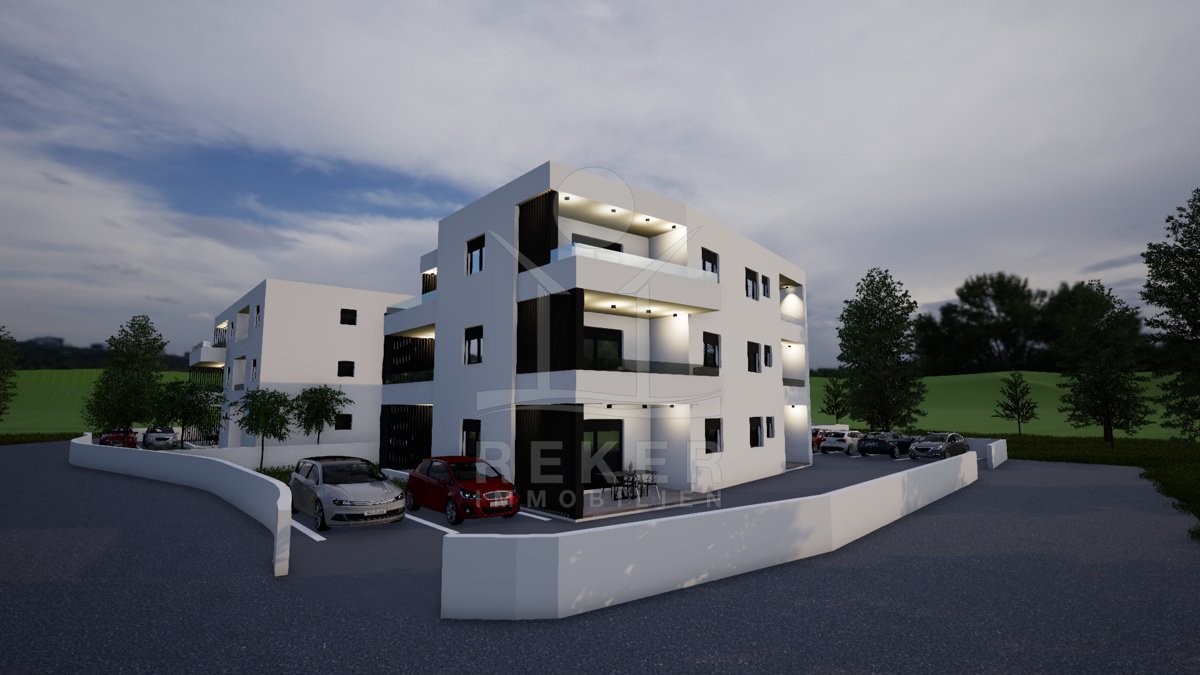 Vodice, ein ruhiges Wohnviertel, rund 700 Meter vom Zentrum entfernt. Auch zum Strand sind es nur wenige Gehminuten. Die Umgebung ist grün, locker bebaut und angenehm still. Das Gebäude wirkt modern, klar, aufgeräumt. Drei Etagen, sechs Wohnungen. Pro Stockwerk zwei Einheiten. Die Fertigstellung ist für Sommer 2026 geplant. Dann ziehen Sie schlüsselfertig ein. Vor dem Haus: zwei Parkplätze für die Wohnung.