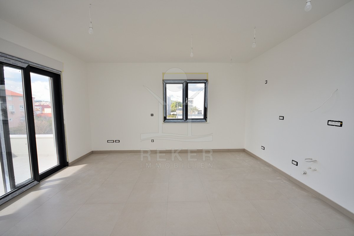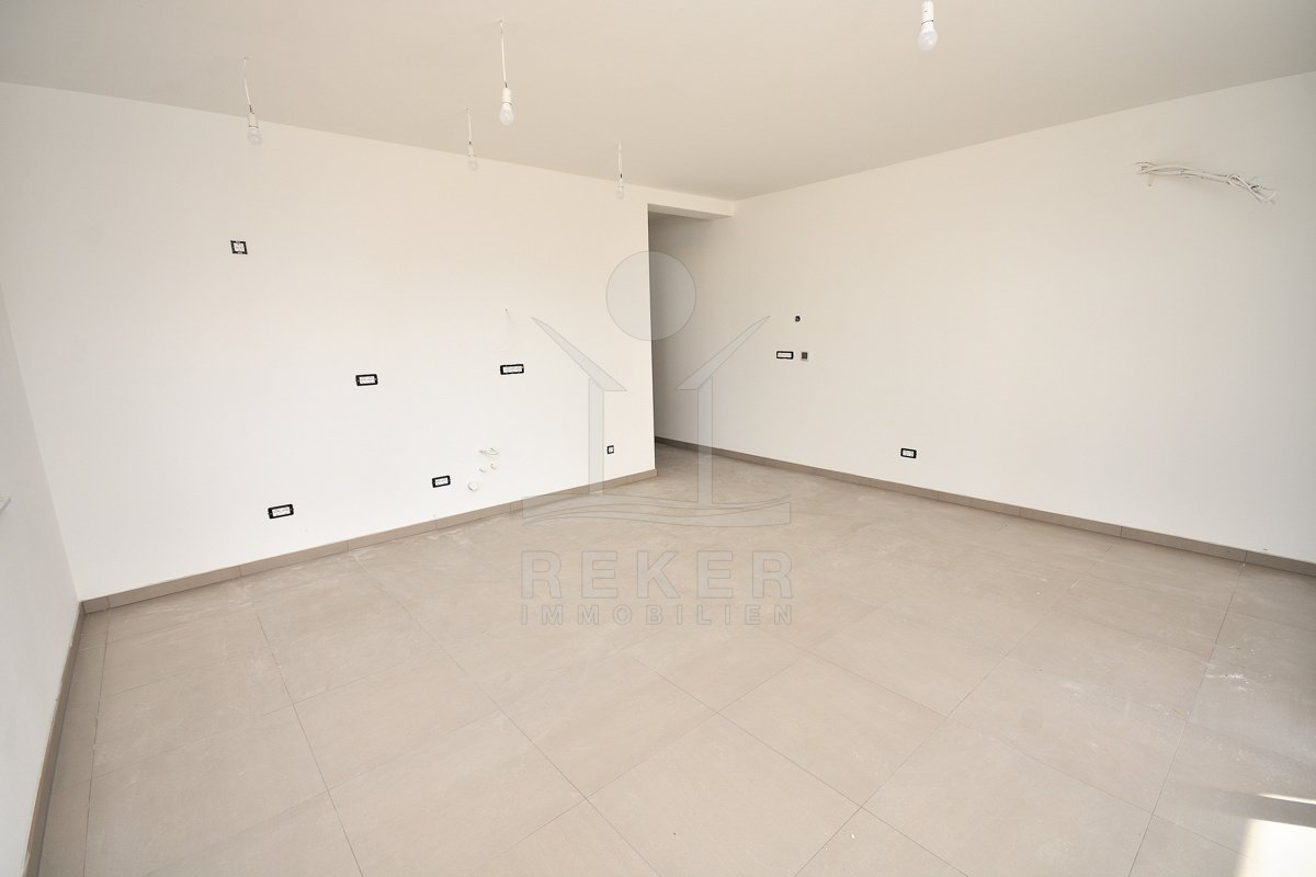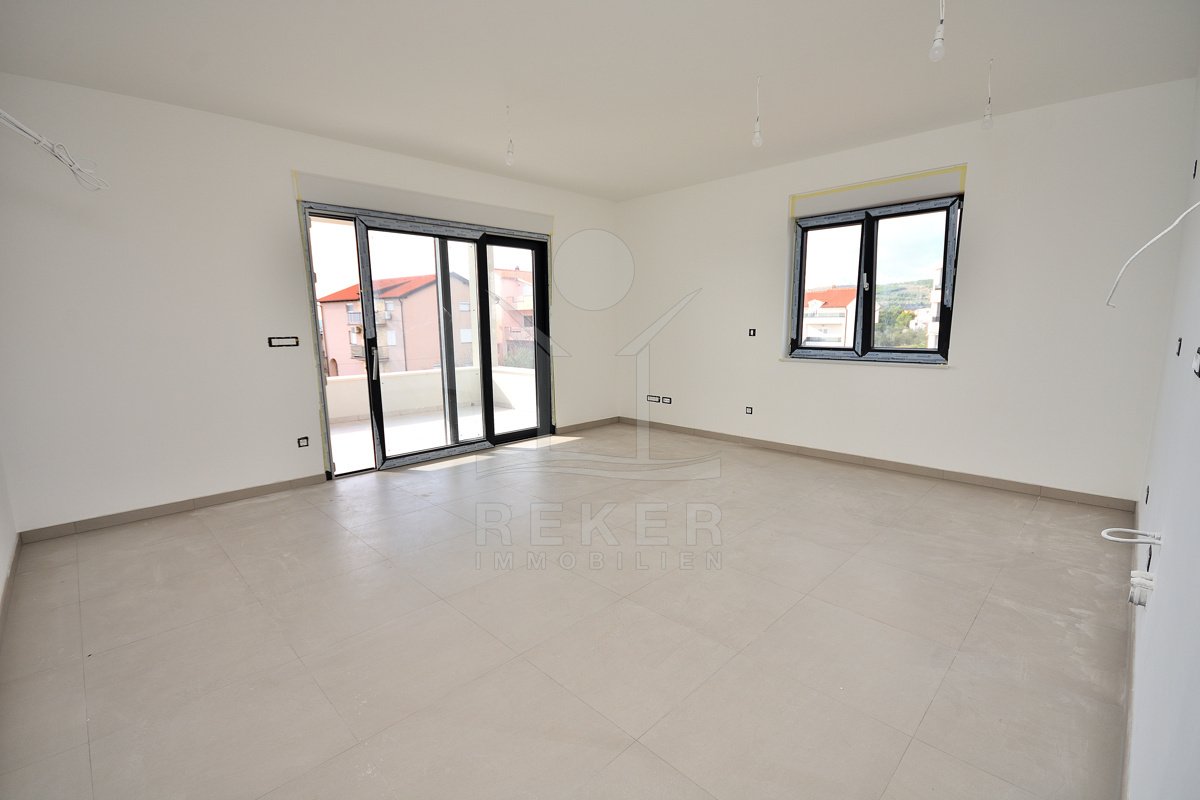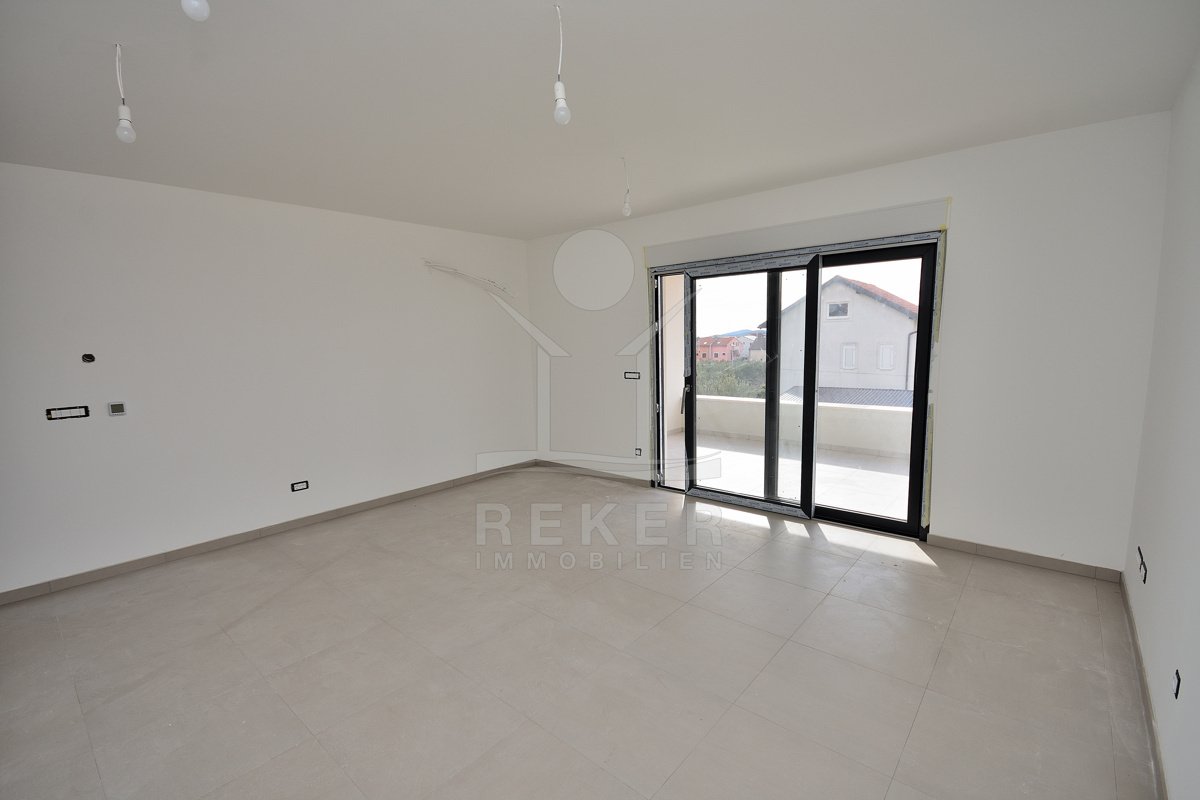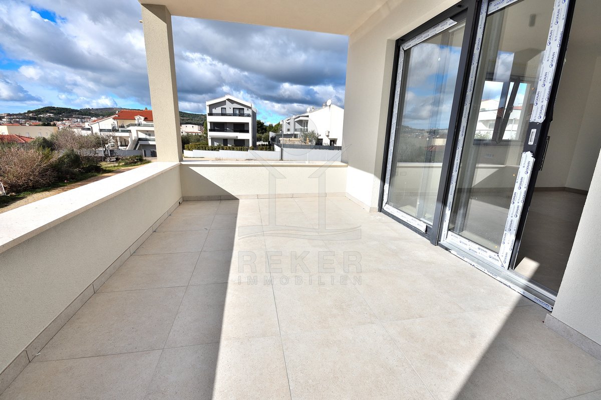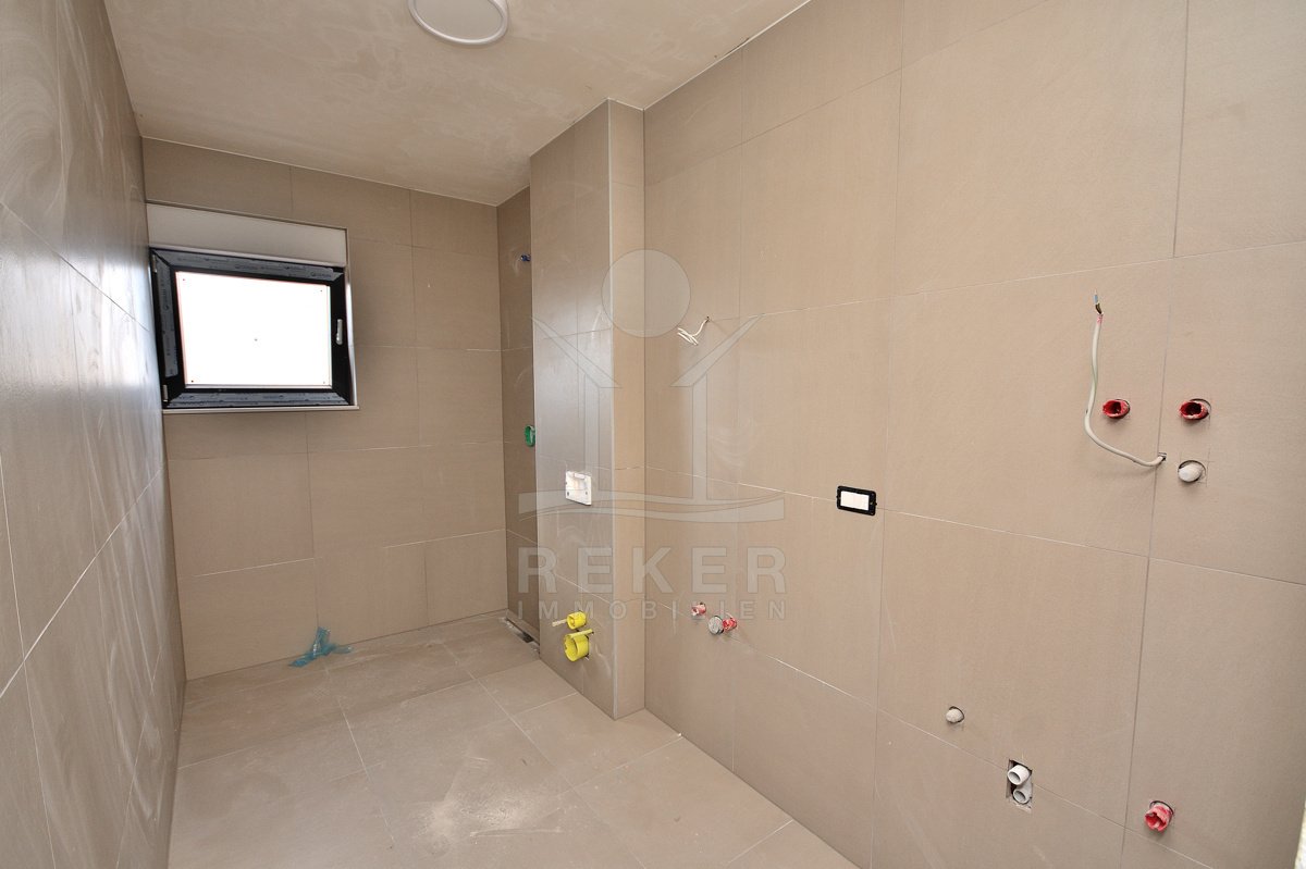 Vodice, ein ruhiges Wohnviertel, rund 700 Meter vom Zentrum entfernt. Auch zum Strand sind es nur wenige Gehminuten. Die Umgebung ist grün, locker bebaut und angenehm still. Das Gebäude wirkt modern, klar, aufgeräumt. Drei Etagen, sechs Wohnungen. Pro Stockwerk zwei Einheiten. Die Fertigstellung ist für Sommer 2026 geplant. Dann ziehen Sie schlüsselfertig ein. Vor dem Haus: zwei Parkplätze für die Wohnung.