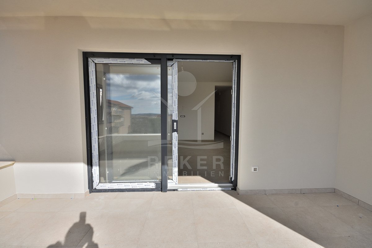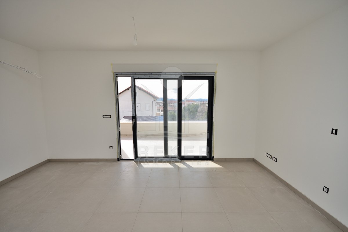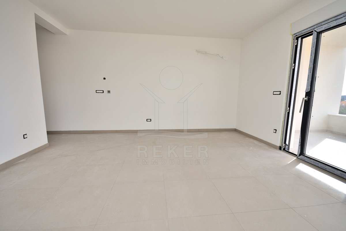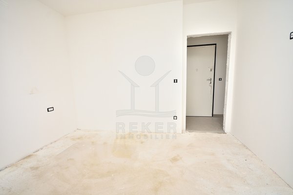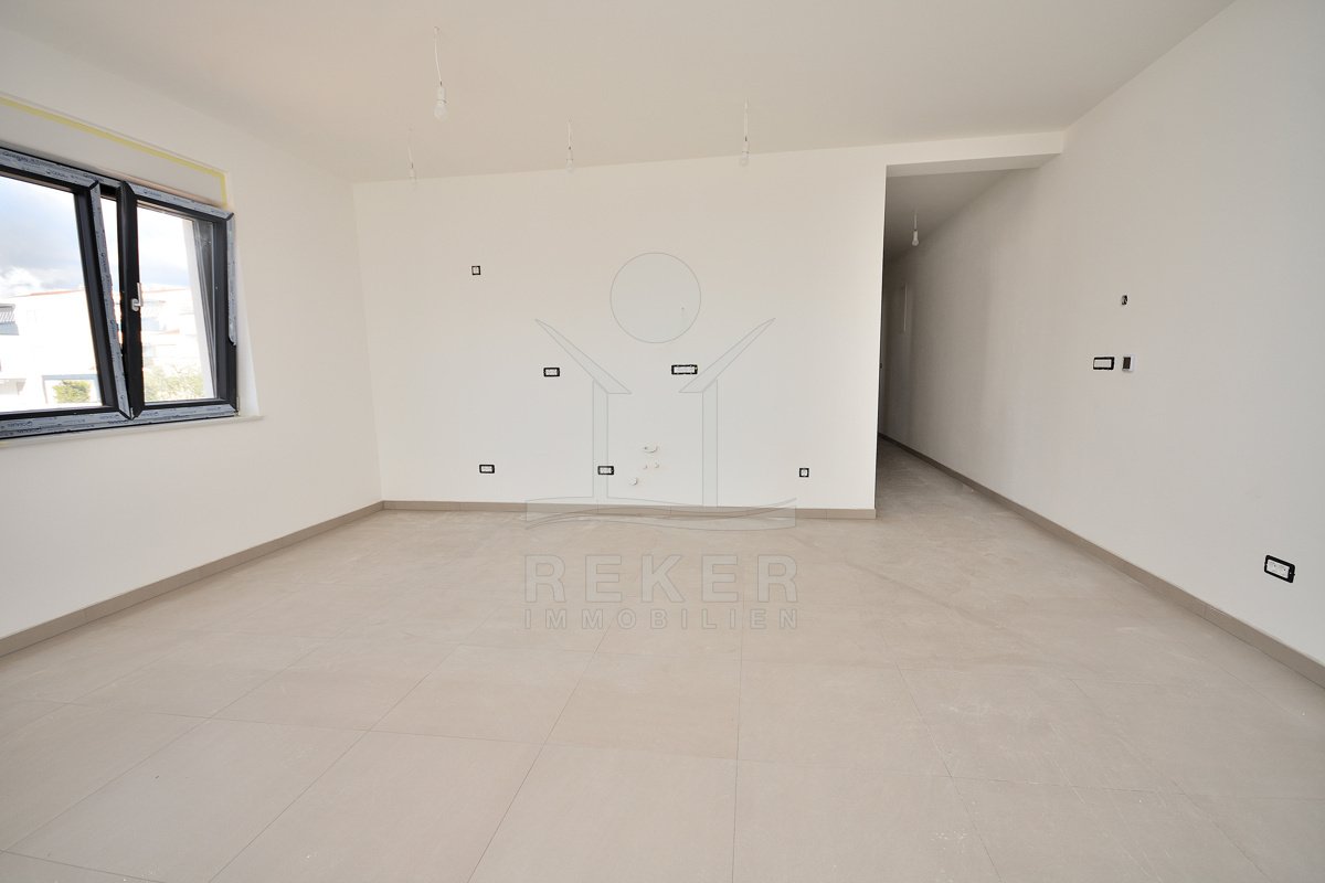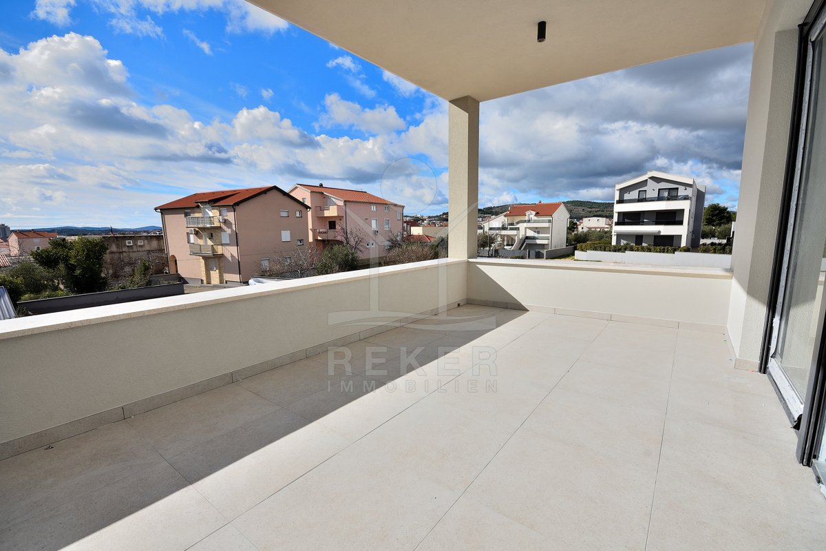 Vodice, ein ruhiges Wohnviertel, rund 700 Meter vom Zentrum entfernt. Auch zum Strand sind es nur wenige Gehminuten. Die Umgebung ist grün, locker bebaut und angenehm still. Das Gebäude wirkt modern, klar, aufgeräumt. Drei Etagen, sechs Wohnungen. Pro Stockwerk zwei Einheiten. Die Fertigstellung ist für Sommer 2026 geplant. Dann ziehen Sie schlüsselfertig ein. Vor dem Haus: zwei Parkplätze für die Wohnung.