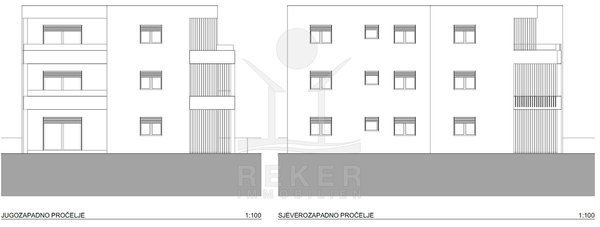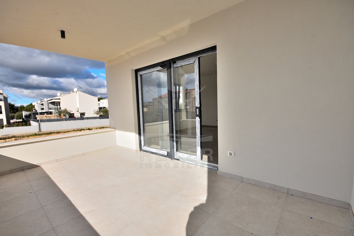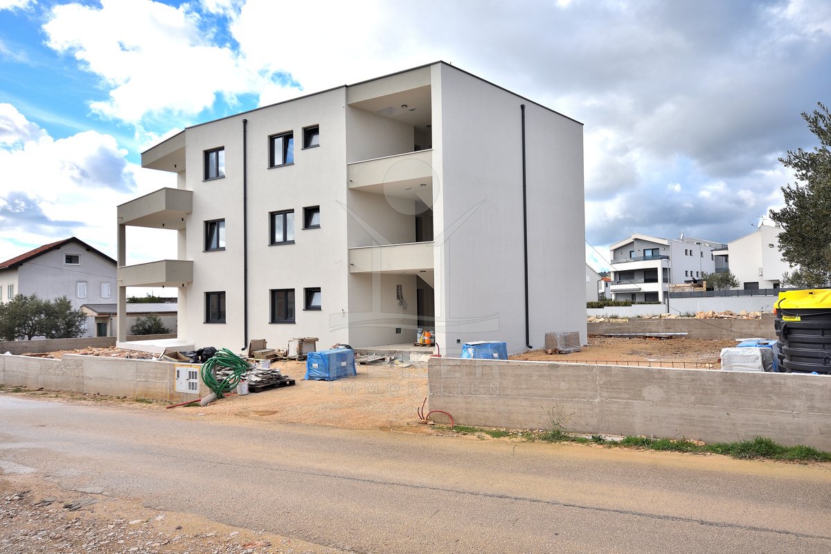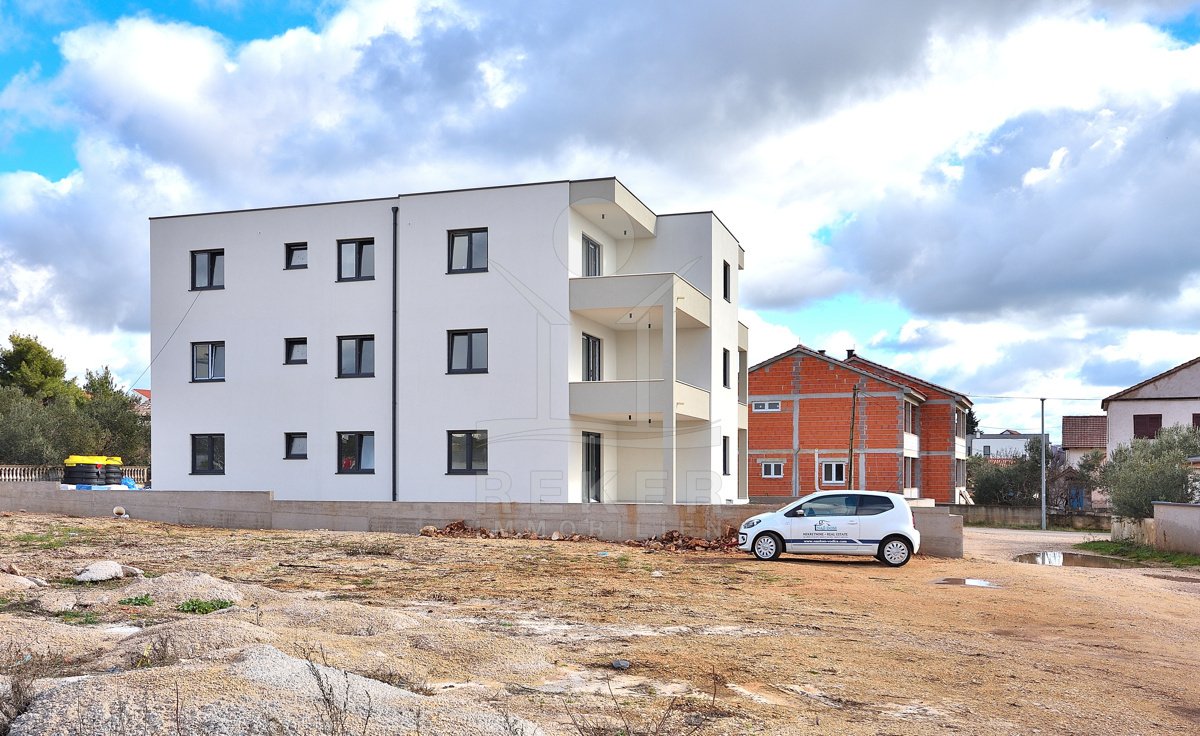Vodice, ein ruhiges Wohnviertel, rund 700 Meter vom Zentrum entfernt. Auch zum Strand sind es nur wenige Gehminuten. Die Umgebung ist grün, locker bebaut und angenehm still. Das Gebäude wirkt modern, klar, aufgeräumt. Drei Etagen, sechs Wohnungen.