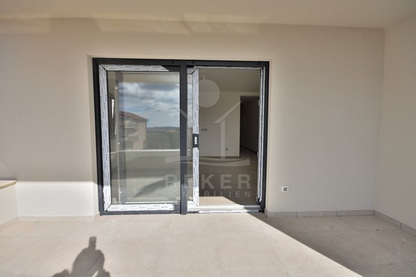 Die Wohnung liegt im ersten Obergeschoss eines modernen Hauses mit nur sechs Einheiten. Vom großen Balkon aus haben Sie freien Blick in Richtung Meer. Ruhige Lage, durchdachter Grundriss, viel Licht.