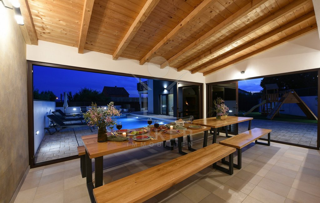 Ein beheizter Pool, eine überdachte Sommerküche und ein vollständig eingezäunter Garten – hier genießen Sie den Sommer in vollen Zügen, ohne das Grundstück zu verlassen. Für entspannte Tage mit der Familie, bei jedem Wetter.