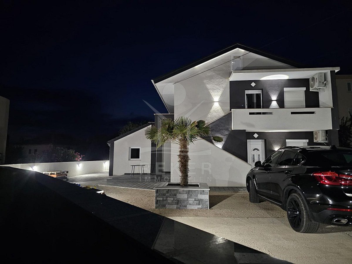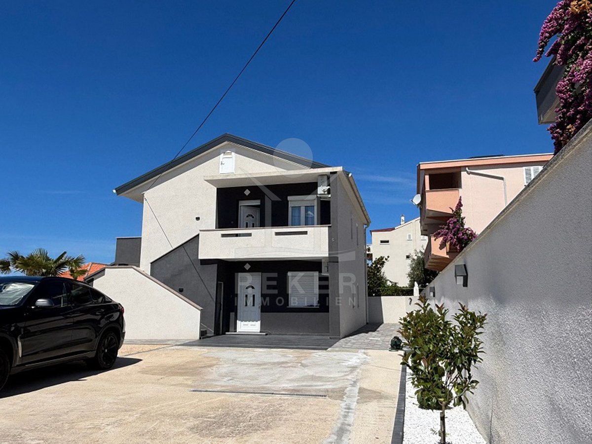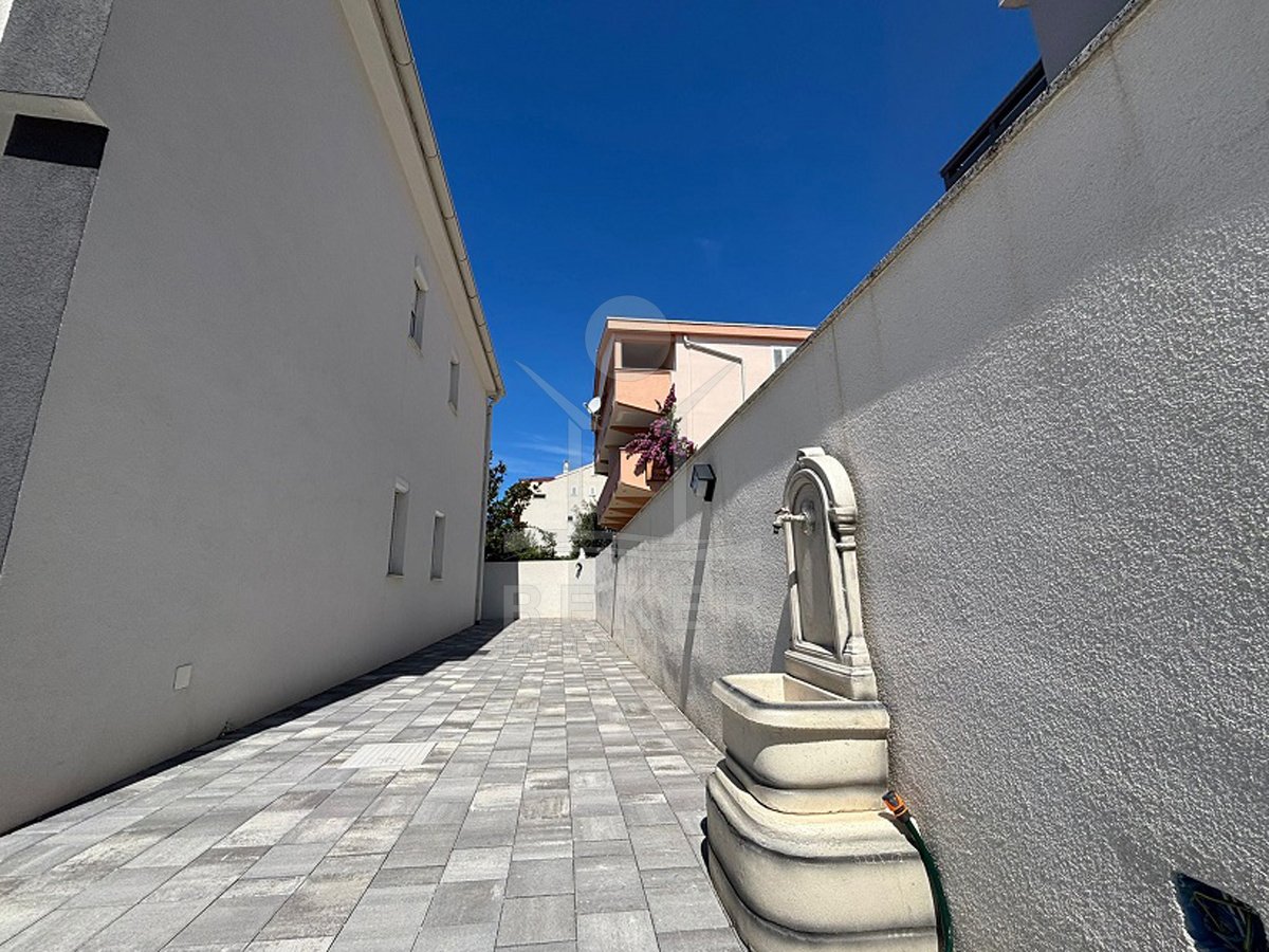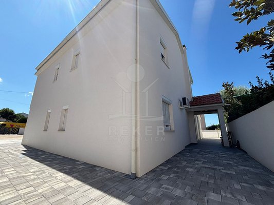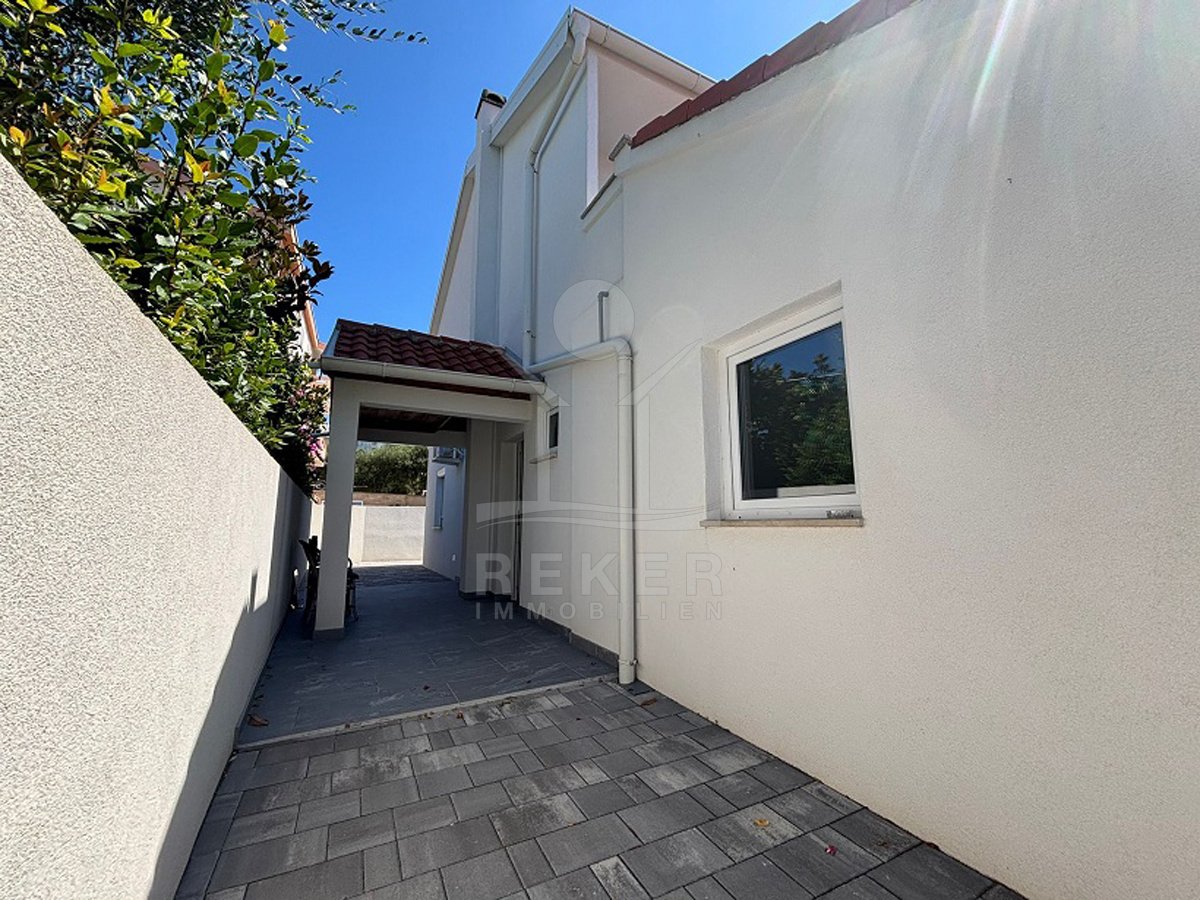 Sie suchen nach einer Immobilie mit mehreren Nutzungsmöglichkeiten? Dieses Wohnhaus in Novalja liegt oberhalb des Stadtzentrums – nur etwa 450 Meter vom Trubel entfernt, und auch der Strand ist in knapp 550 Metern bequem zu Fuß erreichbar. Im Innenhof gibt’s Platz für mehrere Autos – alles ist gepflastert und gepflegt. Ein modernes Tor sichert das Grundstück, und ein paar Zierpflanzen lockern das Bild auf.