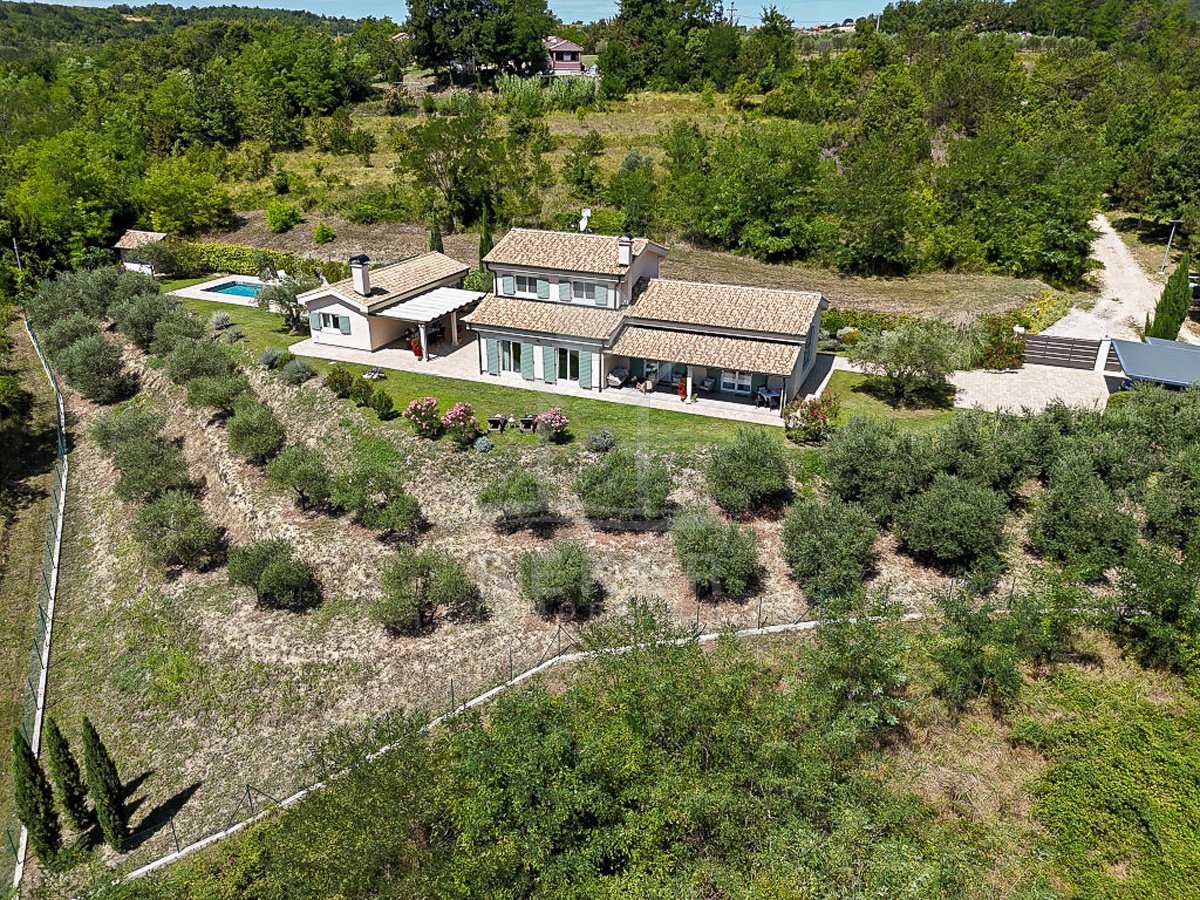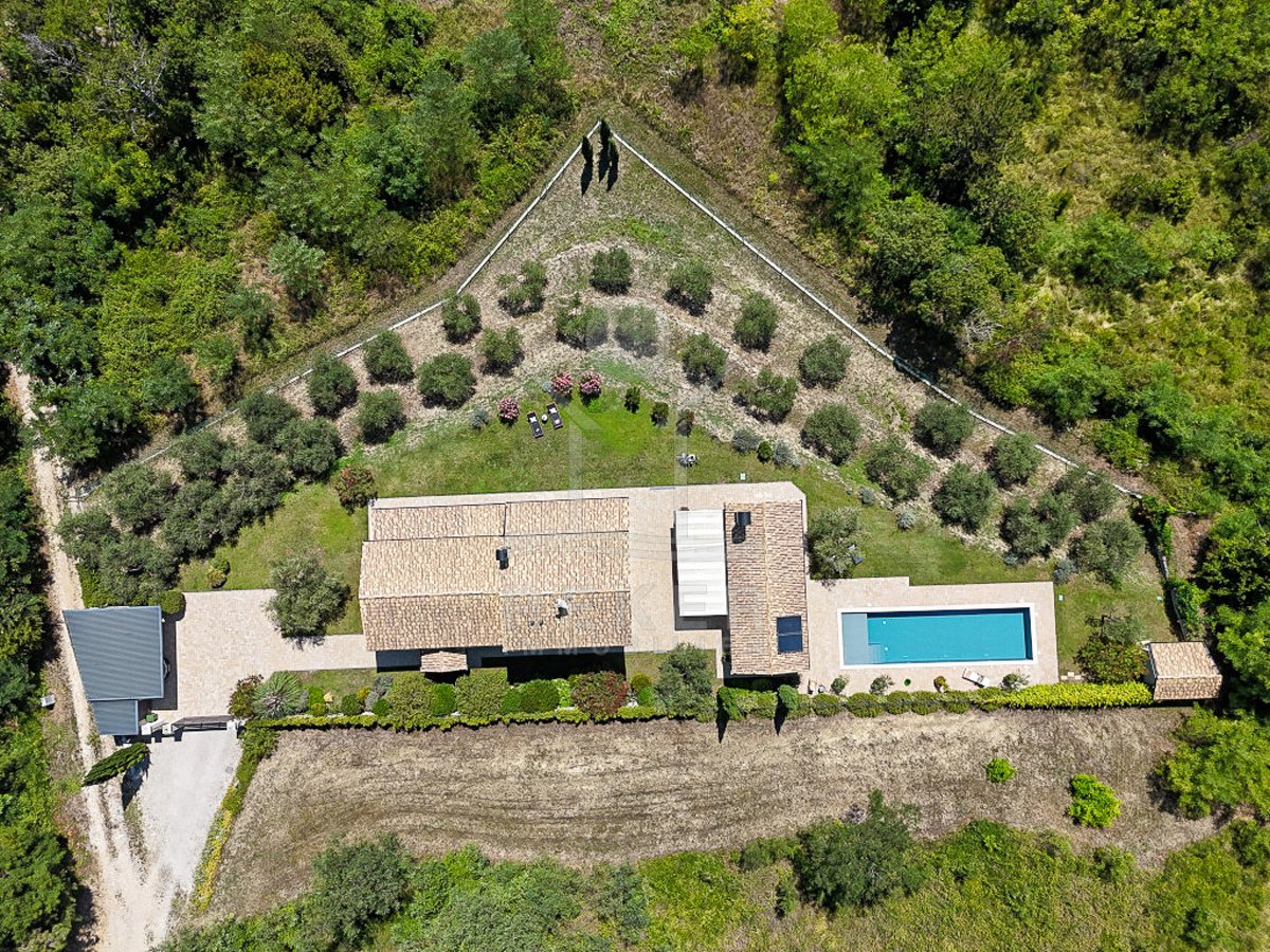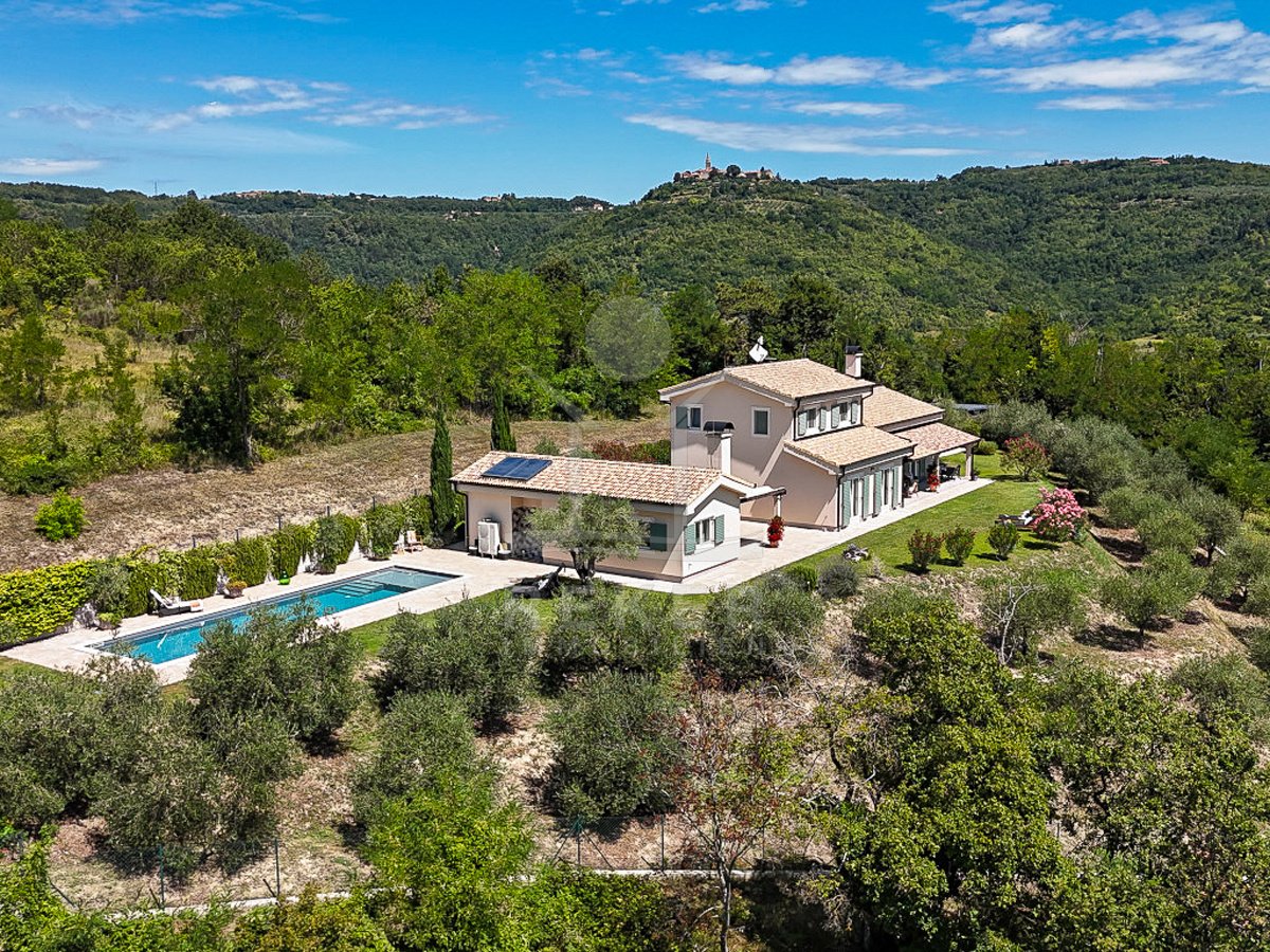 Diese Villa nahe Grožnjan vereint moderne Architektur mit einer besonderen Lage. Rund 6 Kilometer vom Ortszentrum entfernt und nur 10 bis 15 Kilometer vom Meer genießen Sie Ruhe und einen weiten Panoramablick auf Wälder, Weinberge, sanfte Hügel sowie