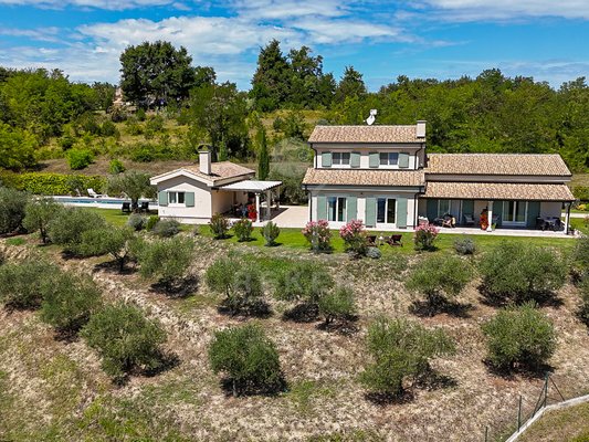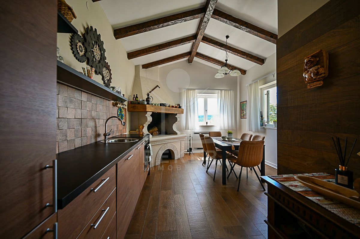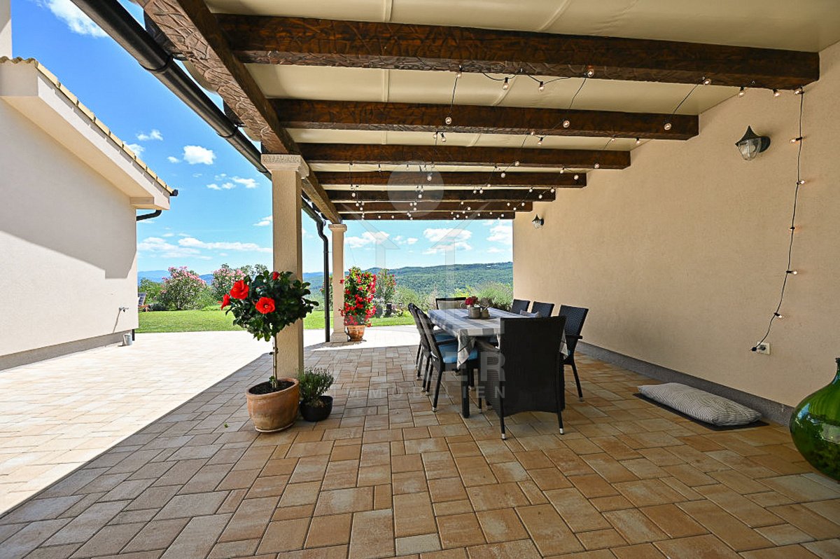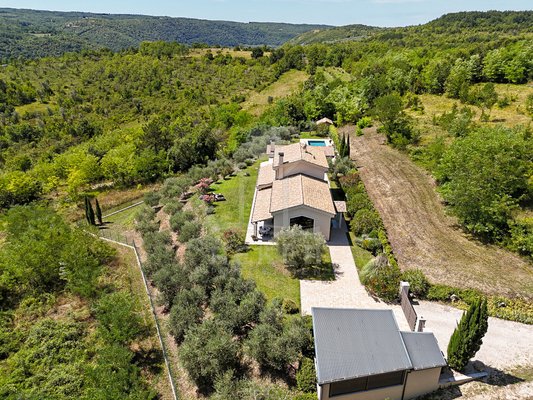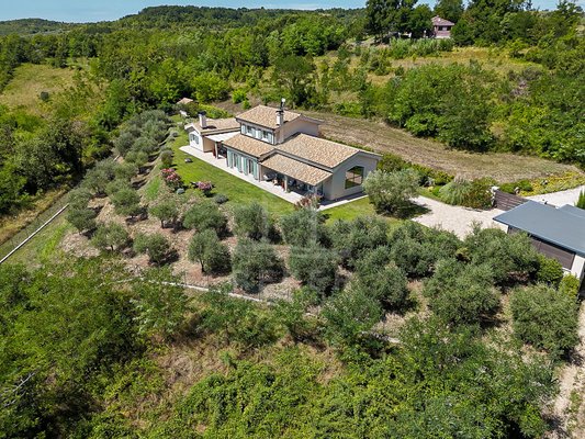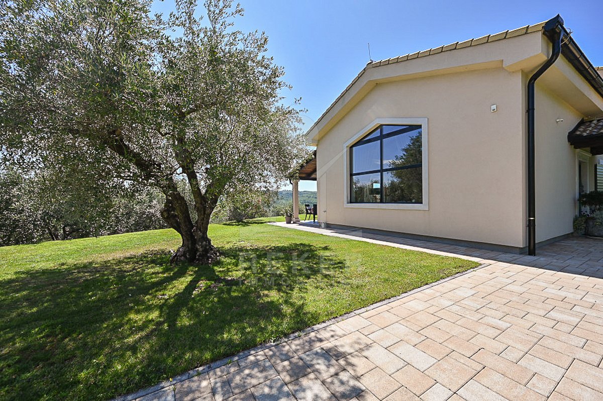 Diese Villa nahe Grožnjan vereint moderne Architektur mit einer besonderen Lage. Rund 6 Kilometer vom Ortszentrum entfernt und nur 10 bis 15 Kilometer vom Meer genießen Sie Ruhe und einen weiten Panoramablick auf Wälder, Weinberge, sanfte Hügel sowie