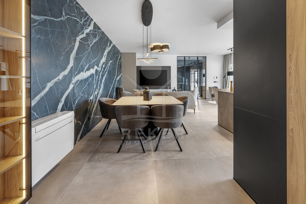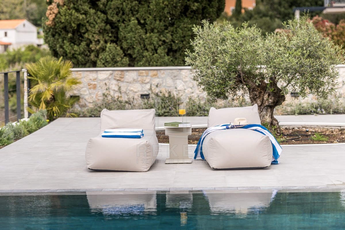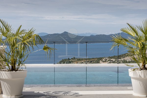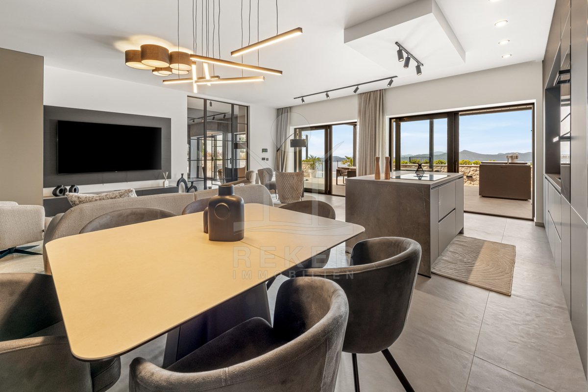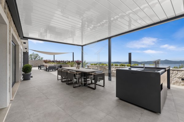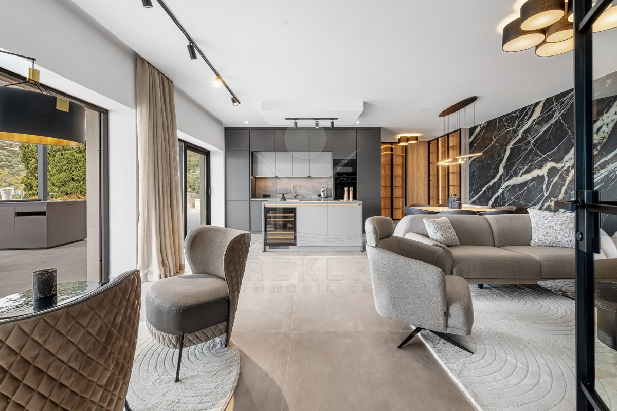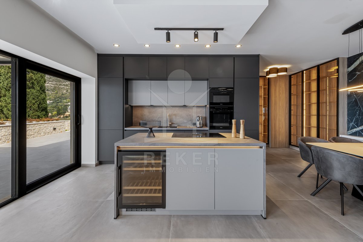 Das rund 1.000 m² große Grundstück ist mit mediterranen Pflanzen gestaltet und bietet zahlreiche Möglichkeiten zum Entspannen im Freien. Mehrere großzügige Terrassen, teilweise überdacht, schaffen unterschiedliche Bereiche – von der gemütlichen Lounge-Ecke bis zum Essplatz im Freien. Das Herzstück ist der Infinity-Pool, der beheizt werden kann und sich mit türkisfarbenem Wasser in die Aussicht aufs Meer einfügt. Eine voll ausgestattete Außenküche macht Grillabende oder Dinnerpartys unter freiem Himmel zum Vergnügen.