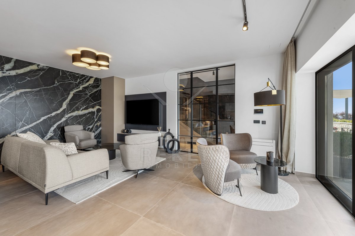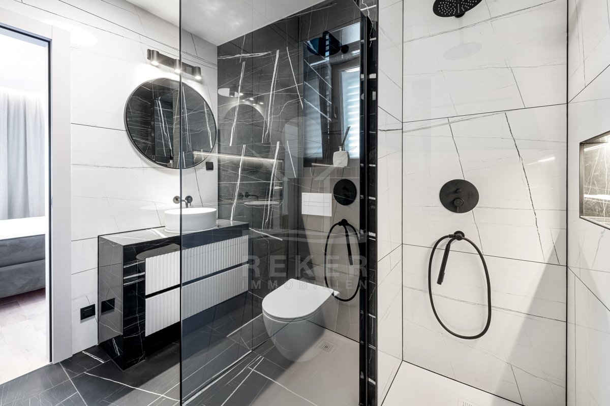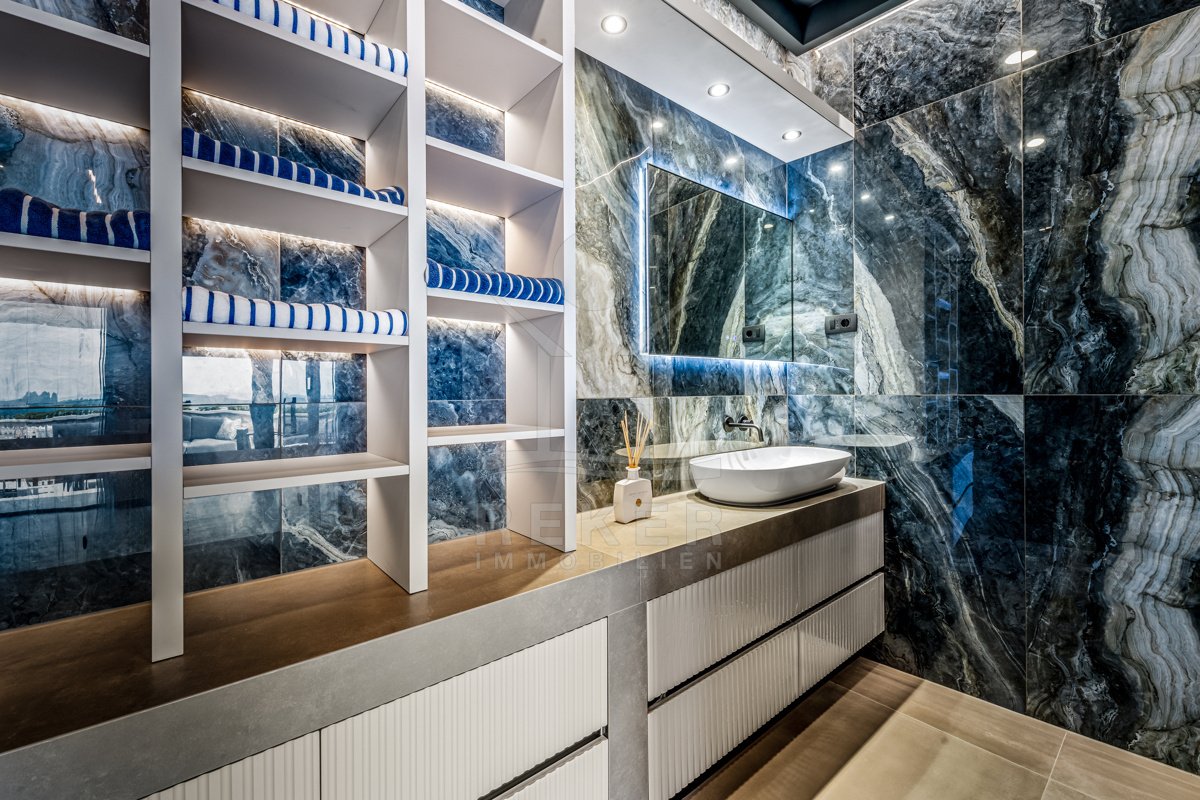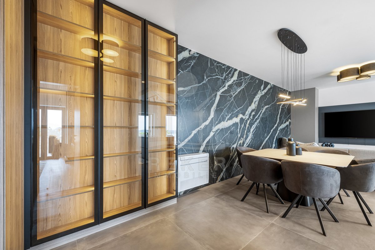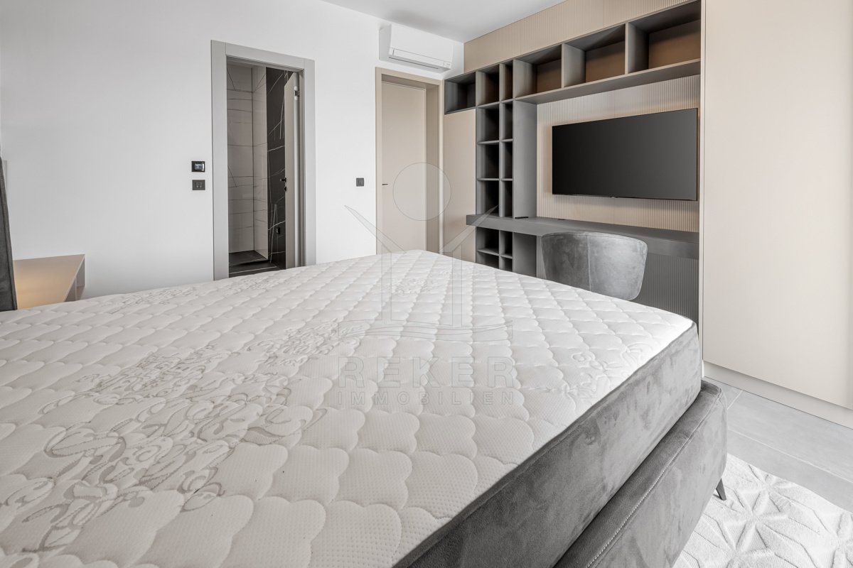 Das rund 1.000 m² große Grundstück ist mit mediterranen Pflanzen gestaltet und bietet zahlreiche Möglichkeiten zum Entspannen im Freien. Mehrere großzügige Terrassen, teilweise überdacht, schaffen unterschiedliche Bereiche – von der gemütlichen Lounge-Ecke bis zum Essplatz im Freien. Das Herzstück ist der Infinity-Pool, der beheizt werden kann und sich mit türkisfarbenem Wasser in die Aussicht aufs Meer einfügt. Eine voll ausgestattete Außenküche macht Grillabende oder Dinnerpartys unter freiem Himmel zum Vergnügen.