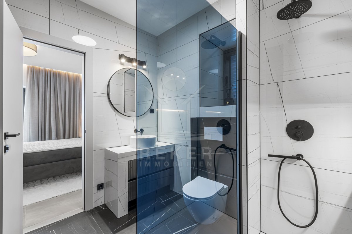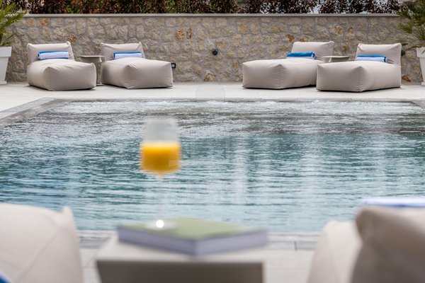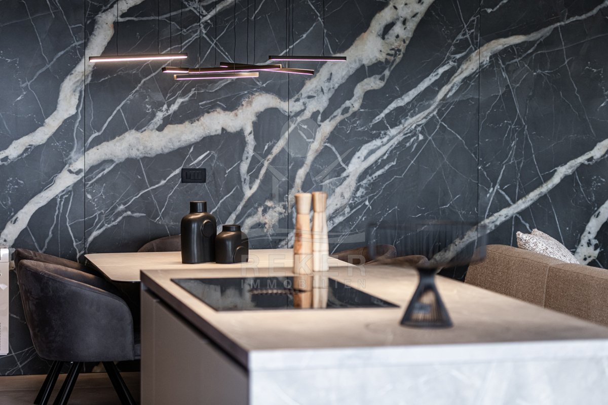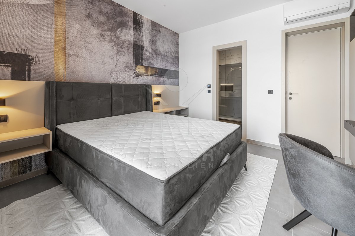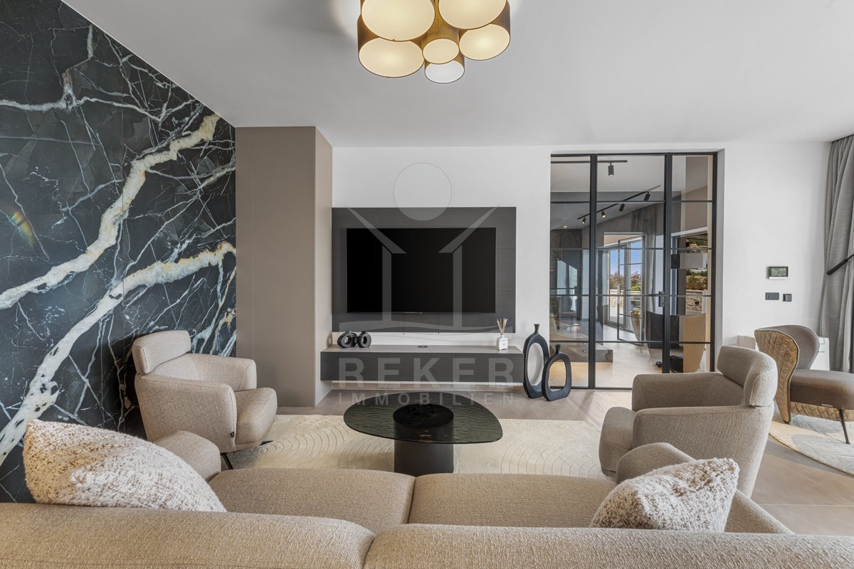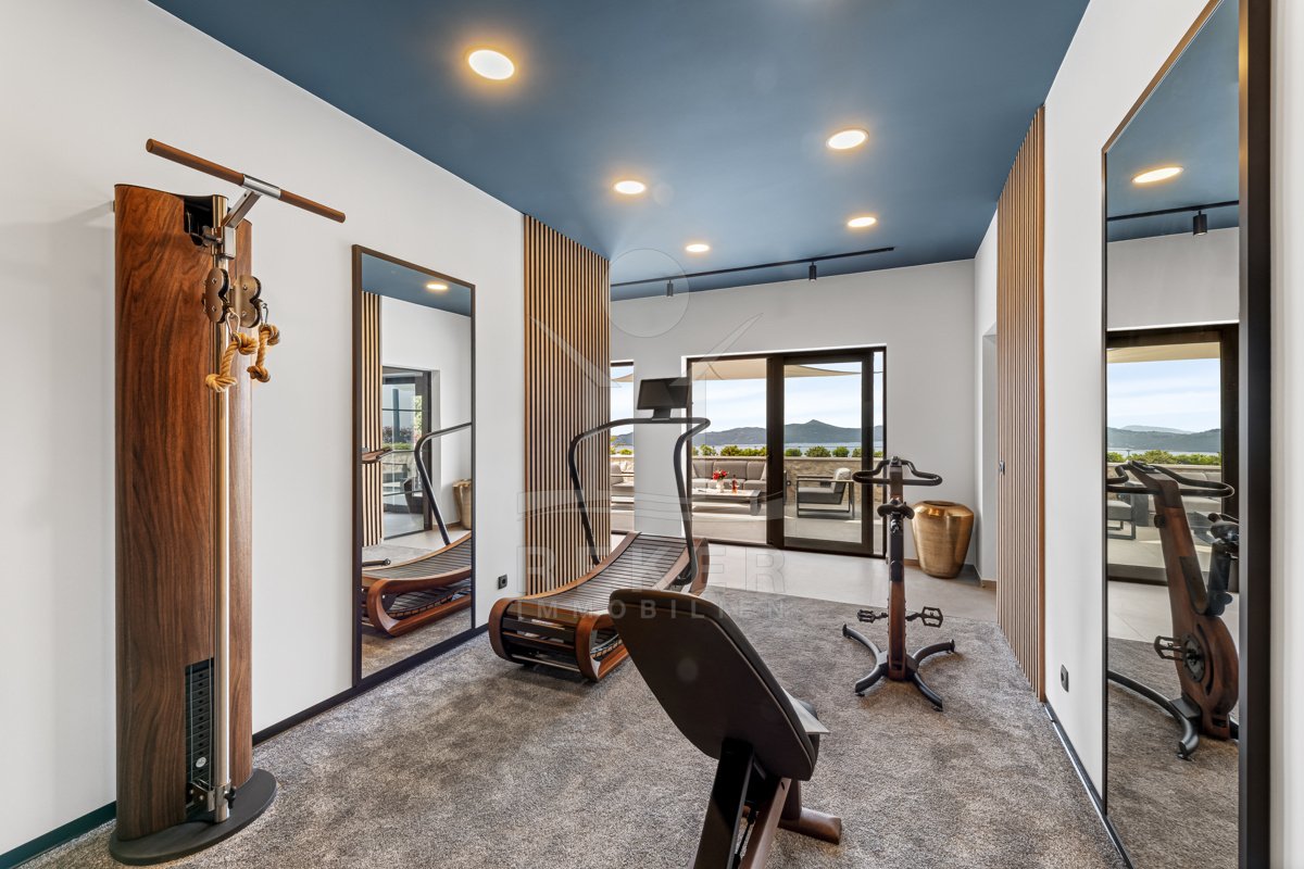 Das rund 1.000 m² große Grundstück ist mit mediterranen Pflanzen gestaltet und bietet zahlreiche Möglichkeiten zum Entspannen im Freien. Mehrere großzügige Terrassen, teilweise überdacht, schaffen unterschiedliche Bereiche – von der gemütlichen Lounge-Ecke bis zum Essplatz im Freien. Das Herzstück ist der Infinity-Pool, der beheizt werden kann und sich mit türkisfarbenem Wasser in die Aussicht aufs Meer einfügt. Eine voll ausgestattete Außenküche macht Grillabende oder Dinnerpartys unter freiem Himmel zum Vergnügen.