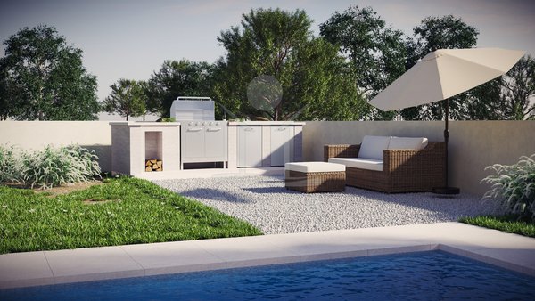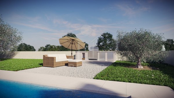 Das Grundstück umfasst 440 m² und bringt Urlaubsatmosphäre direkt nach Hause. Mittelpunkt ist der 28 m² große Pool, umgeben von Gartenflächen und Sitzplätzen. Eine überdachte Outdoor-Küche mit Grill lädt zu langen Sommerabenden ein. Mehrere Terrassen, teils überdacht, teils offen, erweitern den Wohnraum ins Freie. Höhepunkt ist die private Dachterrasse mit weitem Blick über Meer, Inseln und die Sonnenuntergänge.