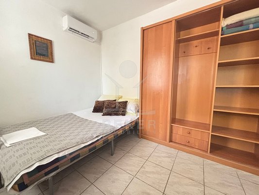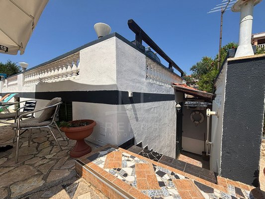 Vor dem Haus finden Sie eine überdachte Terrasse mit Pergola. Das 391 m² große Grundstück ist mit mediterranen Pflanzen angelegt und hält viele Annehmlichkeiten bereit: einen Steingrill für gesellige Abende, eine Außendusche für die Erfrischung nach dem Strand und einen Abstellraum für zusätzlichen Stauraum.