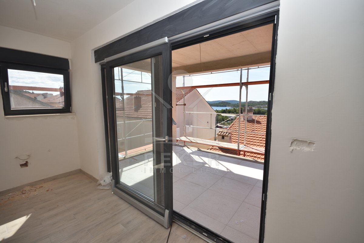Im Stadtteil Crnica von Šibenik wartet eine moderne Drei-Zimmer-Wohnung im ersten Stock eines Neubaus mit nur drei Einheiten. Die Lage zählt zu den gefragtesten der Stadt: ruhig, sonnig und naturnah, zugleich mit schöner Aussicht. Der eigene