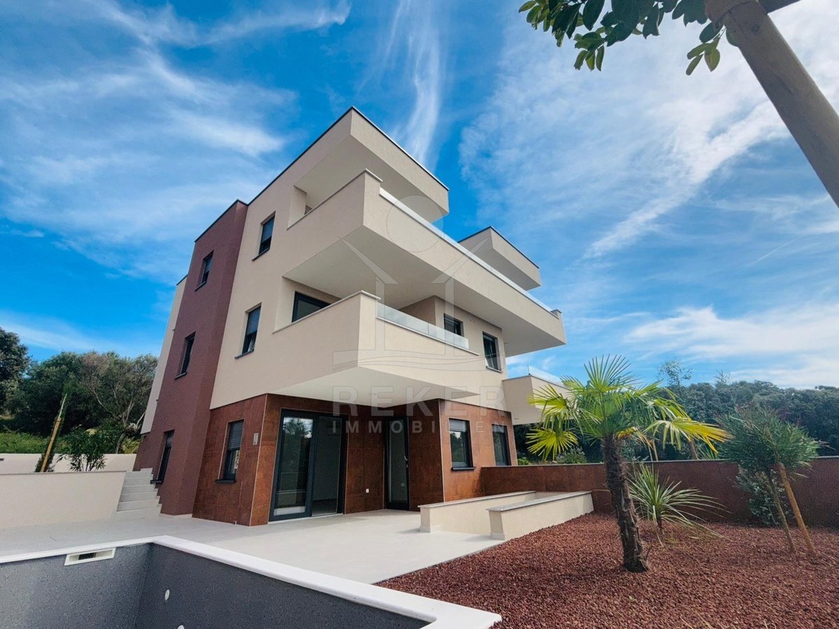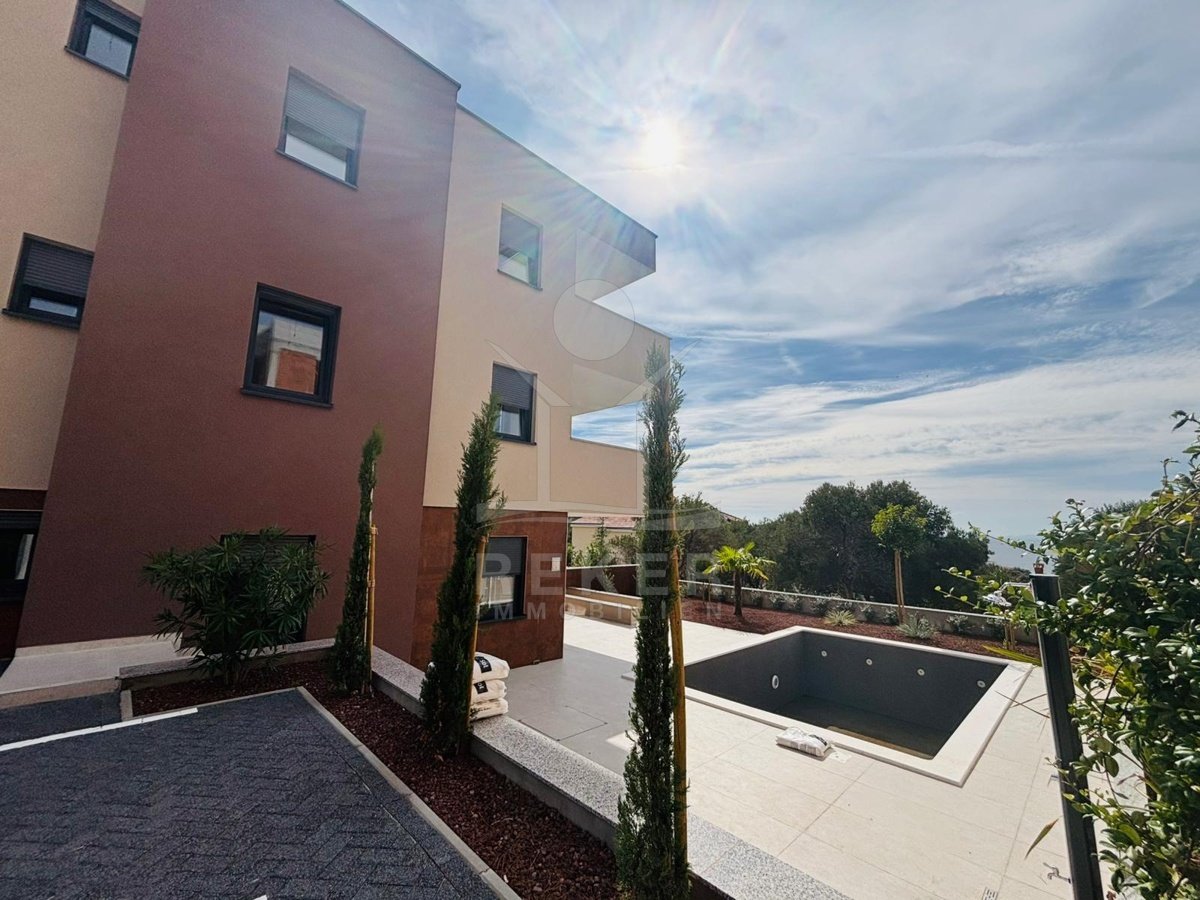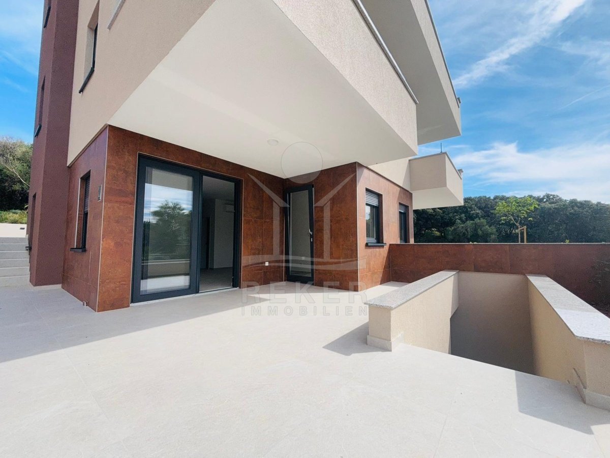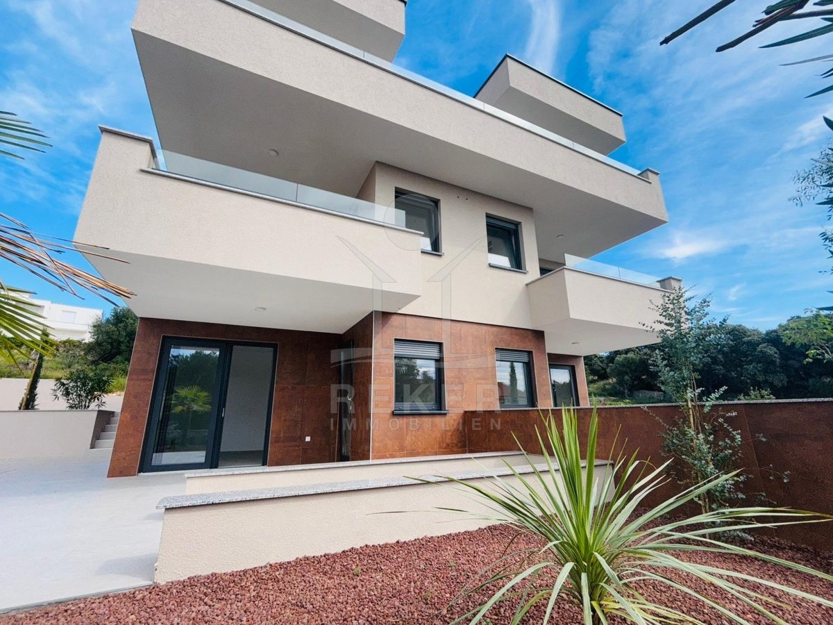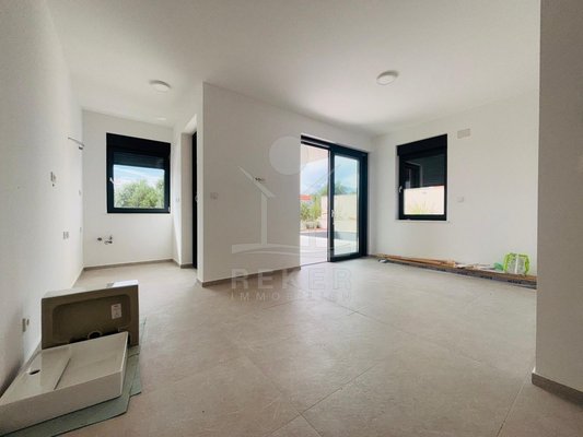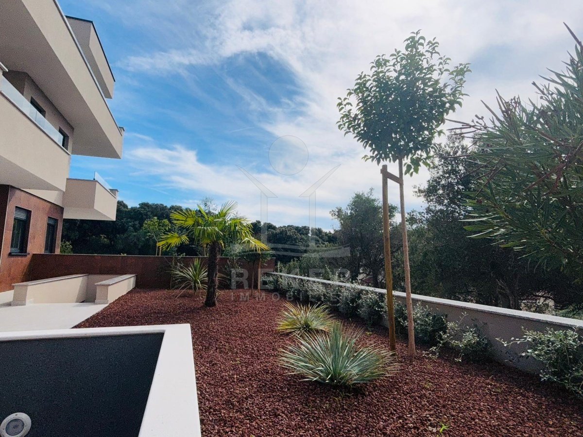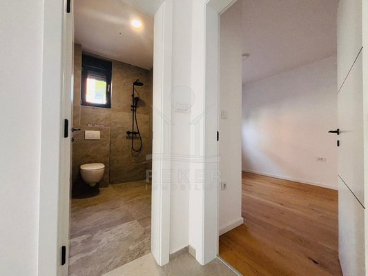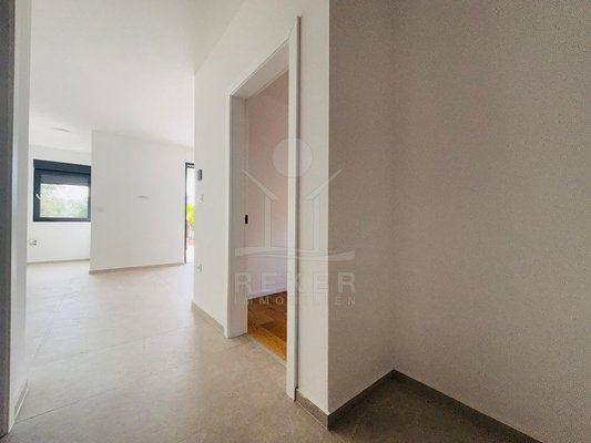Das Haus ist frisch fertiggestellt und umfasst nur fünf Wohnungen auf drei Etagen. Die Architektur setzt auf klare Linien und moderne Formen: warme Naturtöne, Flachdach, großzügige Terrassen. Vor dem Eingang gibt es markierte Parkplätze. Auf der Rückseite wurde das Grundstück terrassiert und gestaltet mit jungen Bäumen, mediterranen Sträuchern und hellen Steinen. Dank der Hanglage genießen Sie schöne Ausblicke und viel Tageslicht. Der Zugang erfolgt bequem über das zentrale Treppenhaus. Alles ist neu, unbewohnt und bereit für den Erstbezug 2025.
