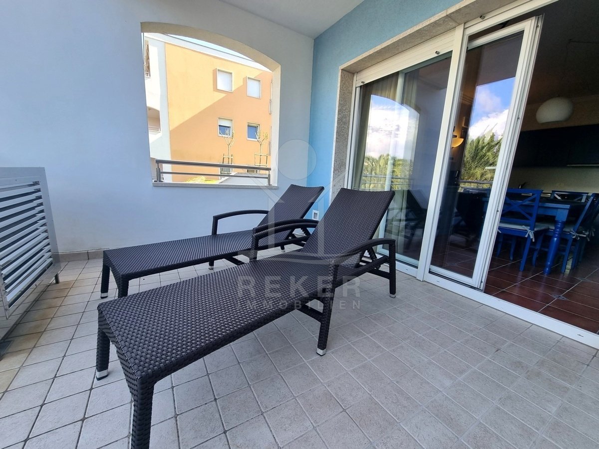 In Crveni Vrh, nur 130 Meter vom Meer entfernt, erwartet Sie ein gepflegtes Apartment im Hochparterre einer modernen Wohnanlage. Die Umgebung ist ruhig, das Zentrum von Umag erreichen Sie nach 3,5 Kilometern. Zusätzlich können Sie einen Stellplatz