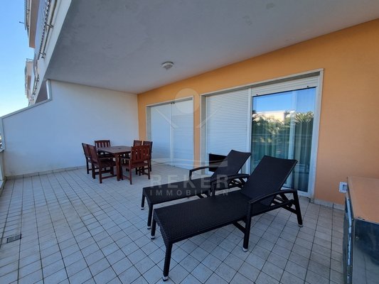 Das Apartment liegt im Hochparterre eines Hauses aus dem Jahr 2005 mit Aufzug. Die überdachte Terrasse mit rund 25 m² ist ein echtes Highlight. Sie bietet reichlich Platz für Mahlzeiten im Freien oder gesellige Abende. Ergänzt wird das Angebot durch einen Gemeinschaftspool, ein Fitnesscenter sowie Vergünstigungen beim Indoor-Pool und Golf. Alles, was Wohnen hier noch angenehmer macht.