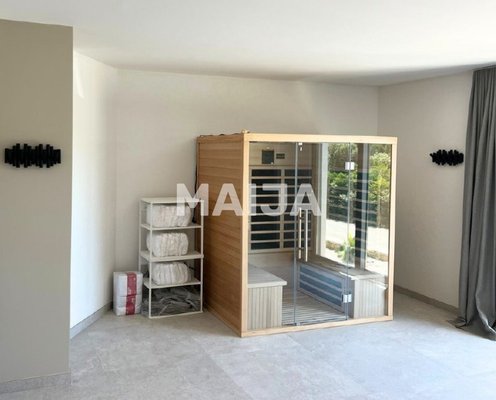 Die Villa verfügt über drei elegante Schlafzimmer, sechs luxuriöse Badezimmer, ein zusätzliches Gäste-WC und ein separates Studio-Apartment – perfekt für die Unterbringung von Gästen.