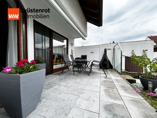 Die große Terrasse lädt zu langen Sommerabenden ein. Die Terrasse kann mit einer Markise beschattet werden.
