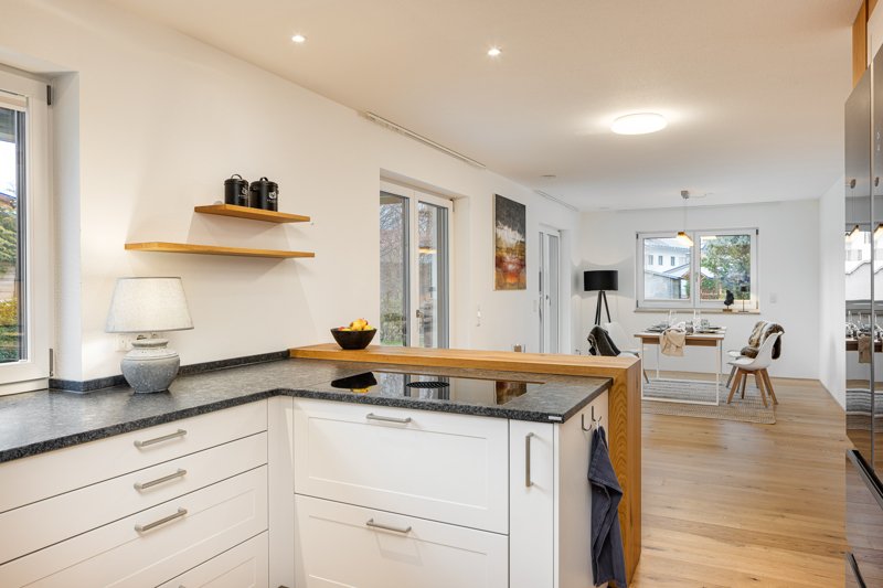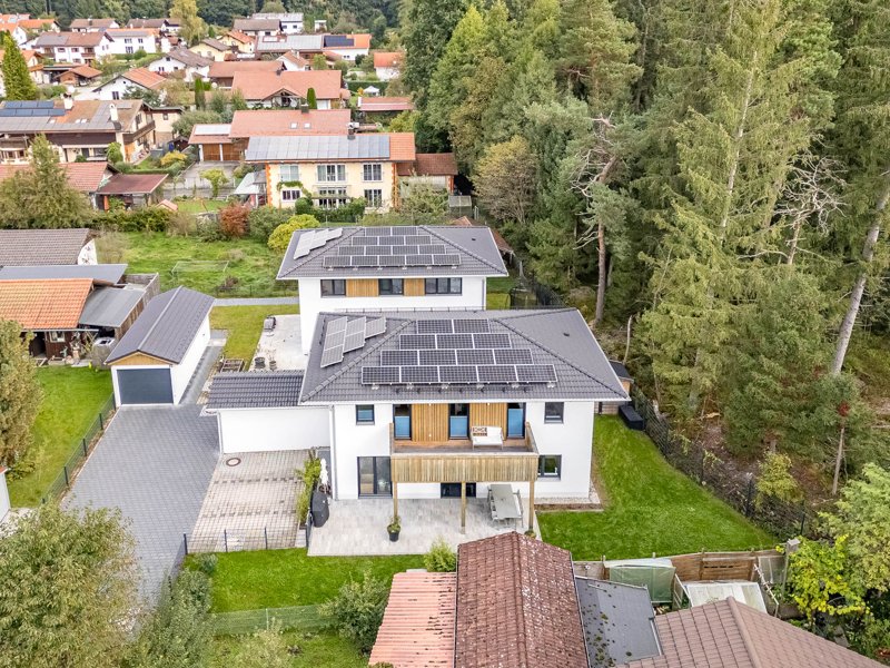 Die Beschreibung passt gleichermaßen für das 2022 in Massivbauweise fertiggestellte Haus mit Garten. Es ist das passende Zuhause für eine Familie mit zwei und auch drei Kindern. Man sieht viel Grün, schaut auf Berge und draußen auf der Terrasse schnuppert man den Duft vom angrenzenden Wald.