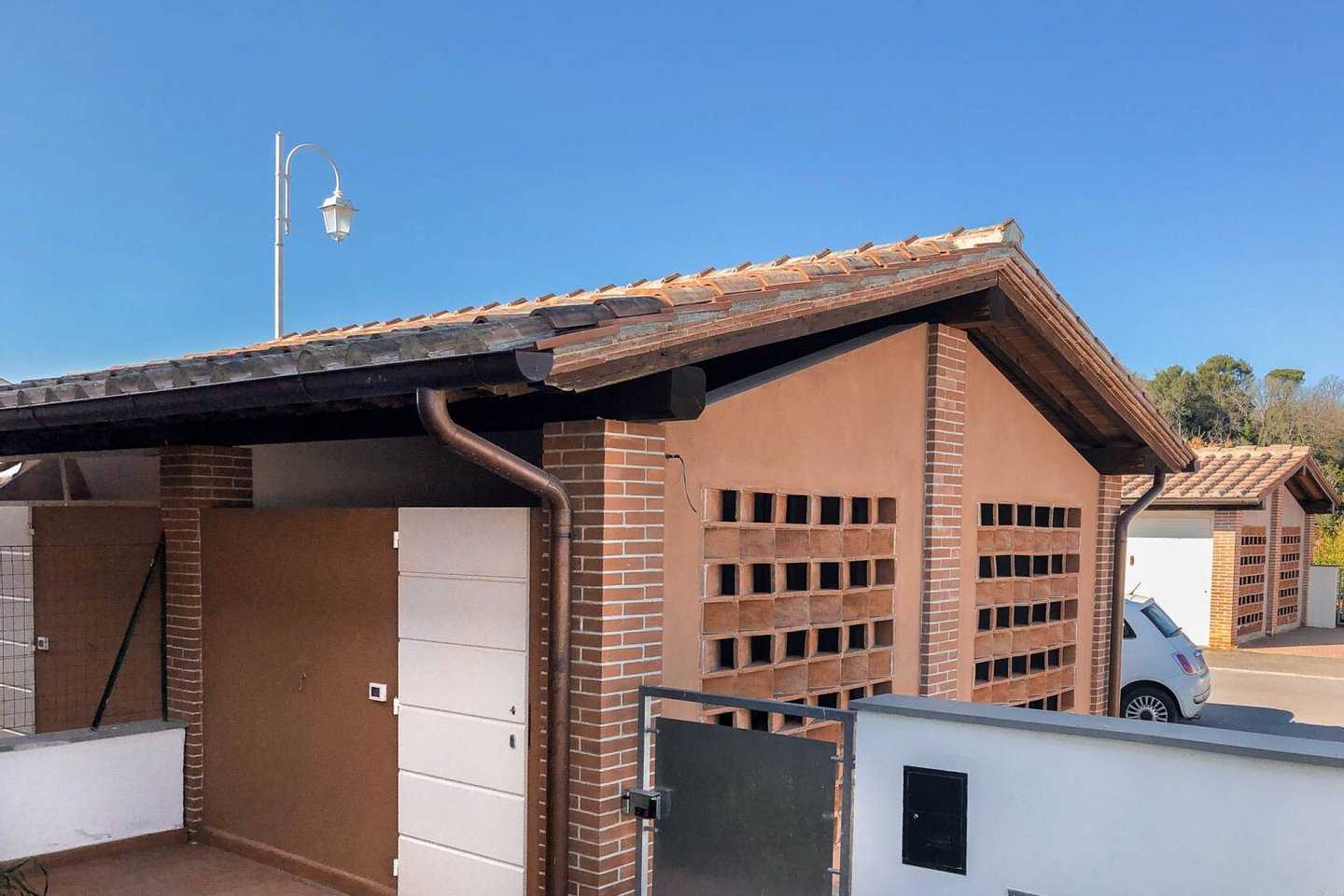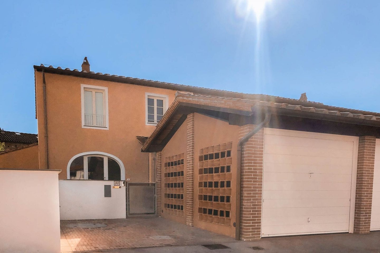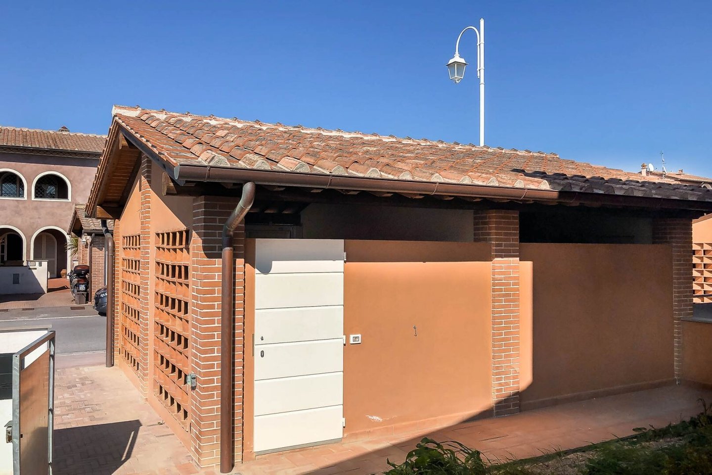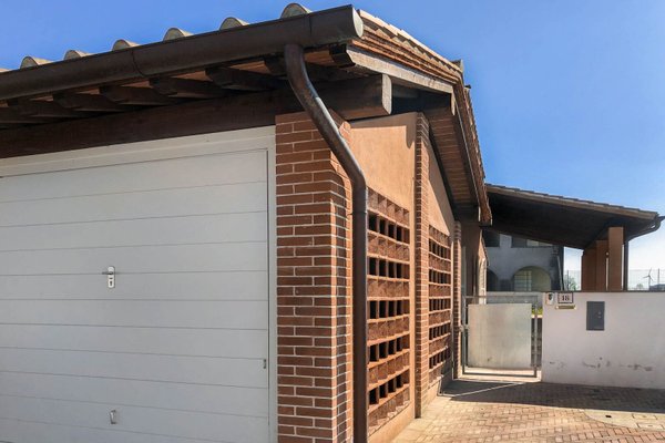 Anbau: 22 qm Garage in separatem Gebäude mit Ziegelfassade im Scheunen- oder "Katzensprung"-Stil, mit doppeltem Zugang, sowohl von der Straße, mit Schwingtor, als auch vom Garten