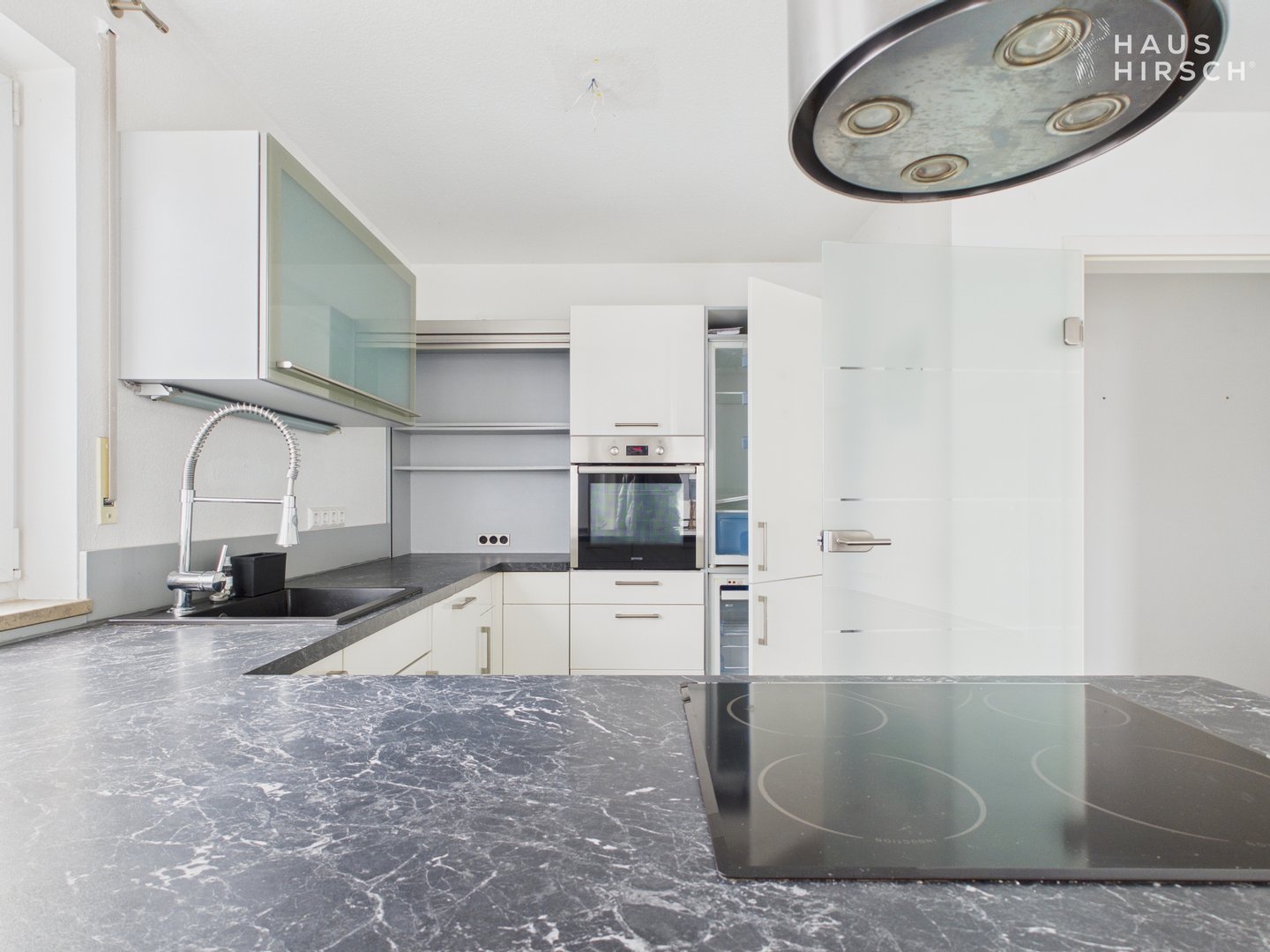 Die angrenzende Küche mit Kochinsel wurde offen in den Raum integriert und bietet neben viel Stauraum und Arbeitsfläche auch hochwertige Elektrogeräte sowie ein zeitloses Designkonzept.