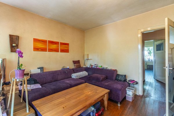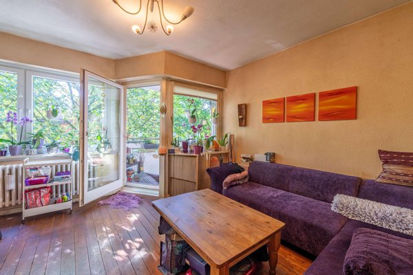 Das knapp 16 m² große, gut proportionierte Wohnzimmer ist zur Straßenseite ausgerichtet und bietet einen wunderbaren Blick in die Baumkronen der Straße.