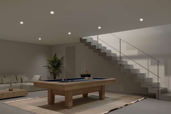 Im Erdgeschoss erwartet Sie ein heller Wohn- und Essbereich mit stilvoller offener Küche – der zentrale Treffpunkt des Hauses. Große Glasfronten schaffen eine nahtlose Verbindung zur Terrasse und zum L-förmigen Pool, der mediterranes Lebensgefühl pur verspricht. Ein Schlafzimmer mit Bad en suite sowie ein Gäste-WC ergänzen diese Ebene.