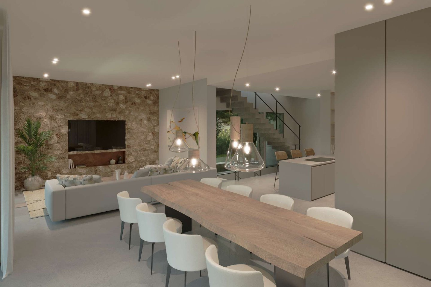 In einer ruhigen Wohngegend von Montferrutx erhebt sich diese moderne Neubauvilla, die schon beim ersten Ankommen durch ihre klare Architektur und die harmonische Einbettung in die Umgebung beeindruckt. Großzügige Fensterflächen eröffnen den Blick in den Garten und vermitteln sofort ein Gefühl von Weite und Leichtigkeit.