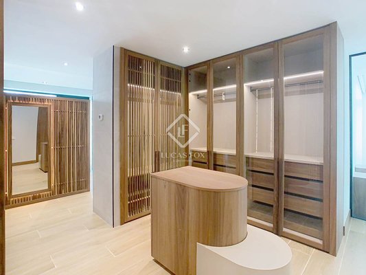 Im zweiten Stock befindet sich das Hauptschlafzimmer mit einem geräumigen Ankleidezimmer mit Einbauschränken, integrierter LED-Beleuchtung und einem maßgefertigten zentralen Schuhregal. Auf einer Seite des Ankleidezimmers befindet sich der Schlafbereich mit einem großen Fenster mit Blick auf die Landschaft. Auf der anderen Seite befindet sich ein elegantes privates Badezimmer mit viel Tageslicht, das mit einer Badewanne, einer separaten Dusche, einem Doppelwaschbecken und hochwertigen Oberflächen ausgestattet ist.