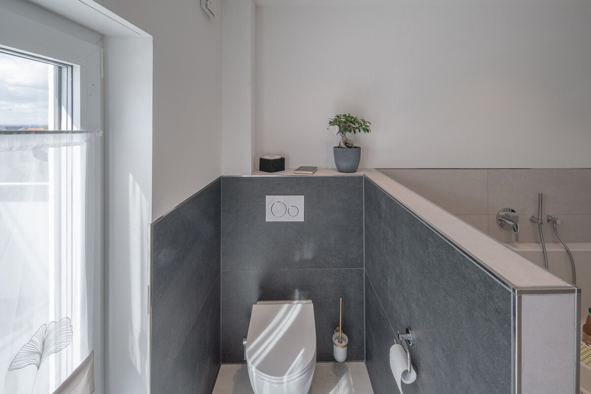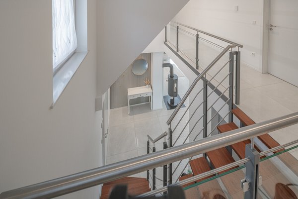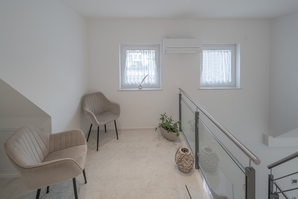 Auf der ersten Ebene erwartet Sie die großzügige Küche, Wohnzimmer, Arbeitszimmer und die großzügige Terrasse. Die zweite Ebene verfügt über zwei Kinderzimmer, Elternschlafzimmer, Tageslichtbad mit Sauna, sowie Hauswirtschaftsraum. Es kann auch ein eigener Garten genutzt werden.