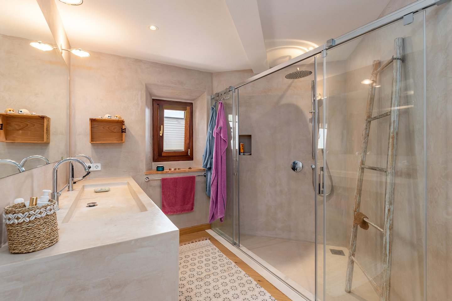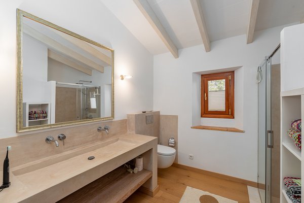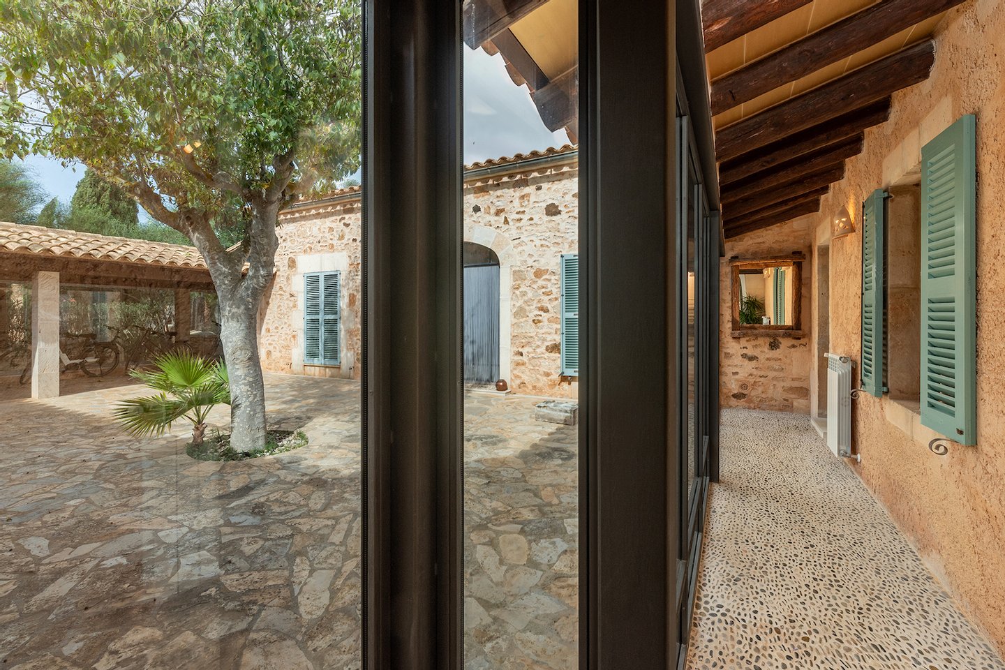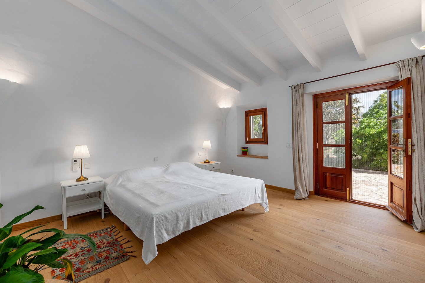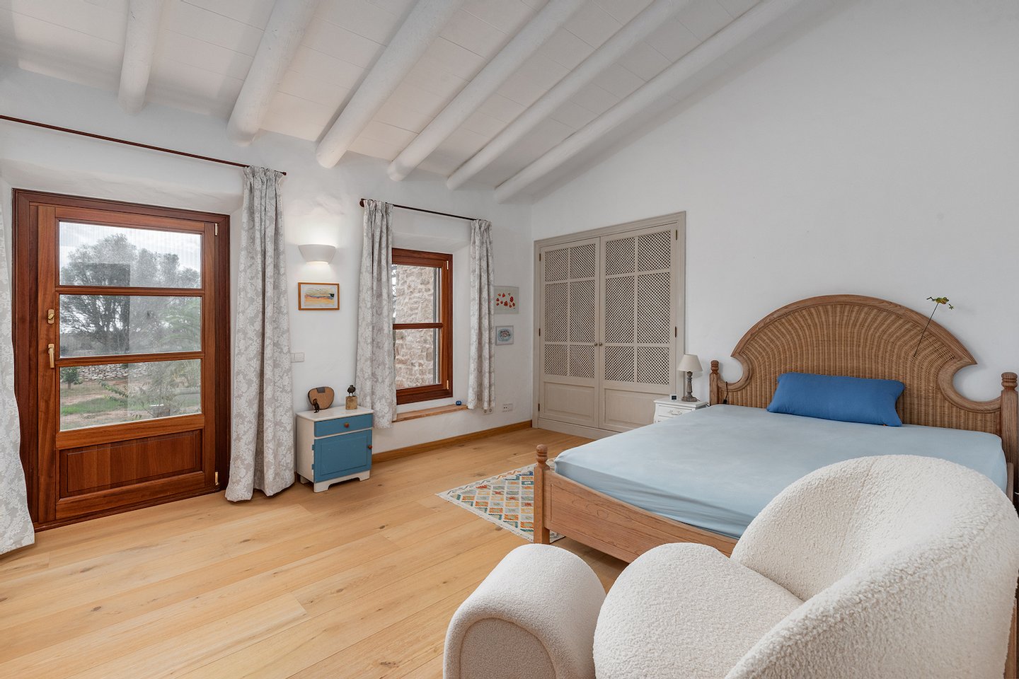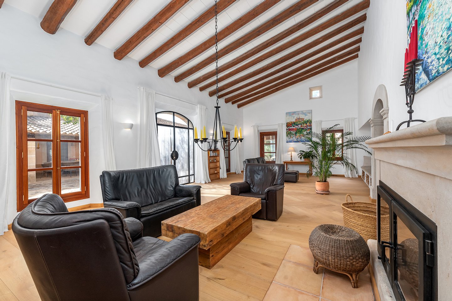 Ein Flur führt vom Essbereich in den Schlaftrakt, der über insgesamt fünf Schlafzimmer und vier stilvolle Badezimmer verfügt. Das Hauptwohnzimmer mit einem weiteren Kamin liegt im hinteren Teil der Finca und lädt zum Verweilen ein.