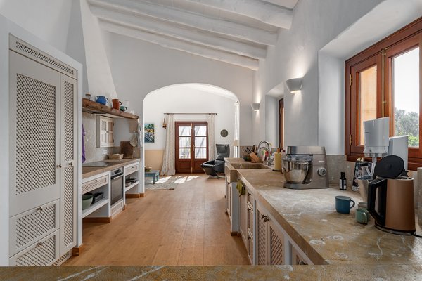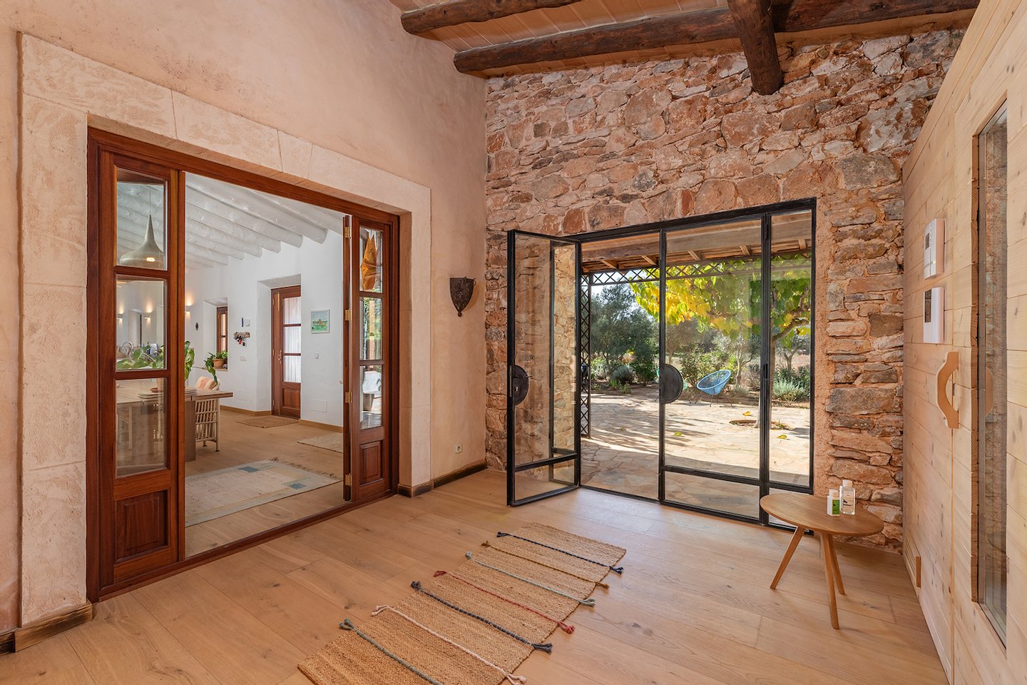 Die ebenerdige Finca bietet eine Wohnfläche von ca. 305 m² und überzeugt durch ihre besondere Raumaufteilung und die stilvolle Gestaltung. Bereits beim Betreten spüren Sie die warme, einladende Atmosphäre, die durch hohe Decken mit freiliegenden Holzbalken unterstrichen wird. Der vordere Bereich der Immobilie beherbergt einen großzügigen Essbereich mit offener Wohnküche und einen Kamin, der an kühleren Abenden für gemütliche Stunden sorgt. Ein separater Raum mit Natursteinwand beherbergt eine Sauna.