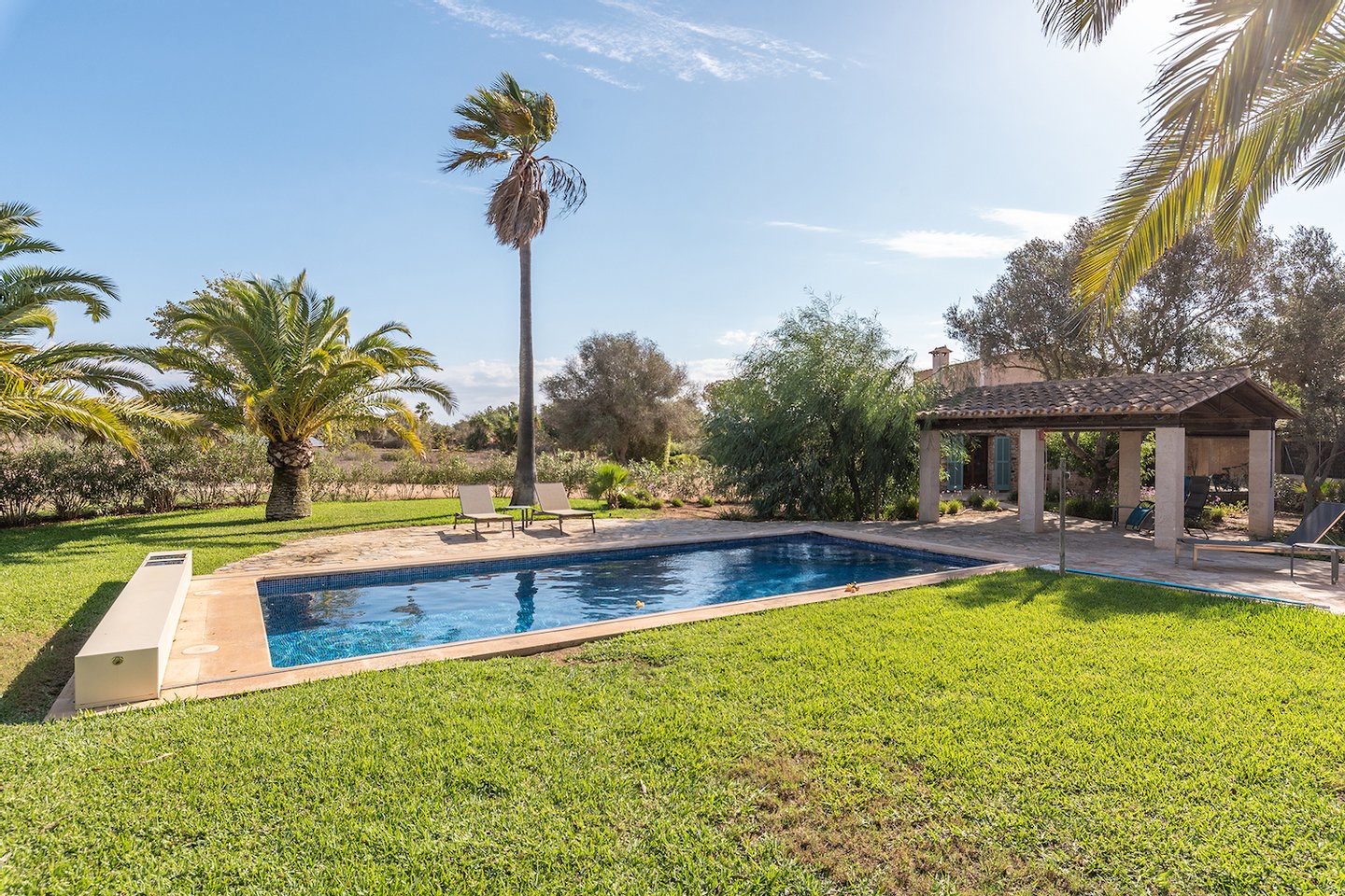 Der charmante Innenhof ist direkt vom Wohn- und Essbereich zugänglich und unterstreicht den authentisch mallorquinischen Stil des Hauses. Zahlreiche überdachte Terrassen schaffen vielfältige Rückzugsorte und bieten zu jeder Tageszeit angenehme Aufenthaltsmöglichkeiten im Freien. Der gepflegte Garten ist liebevoll mit einheimischen Pflanzen gestaltet und bietet eine grüne Oase der Erholung. Der leicht separat gelegene Poolbereich mit großzügiger Sonnenterrasse rundet das luxuriöse Ambiente perfekt ab.
