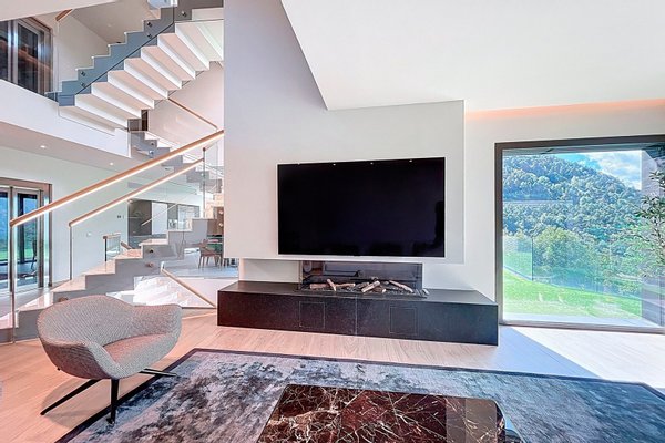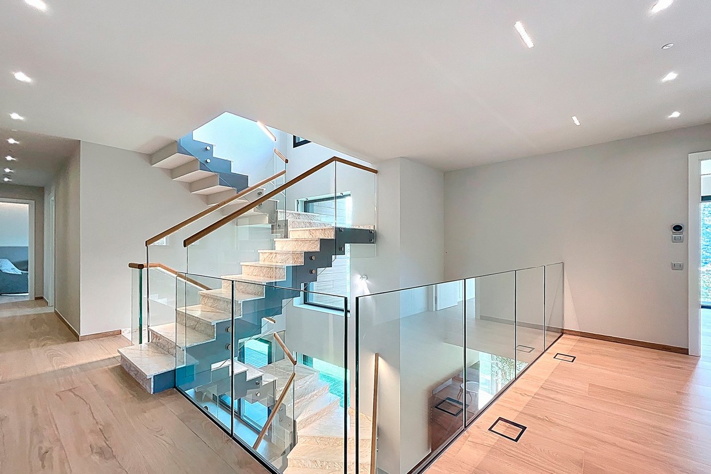 Das Wohngebiet im Erdgeschoss vereint offene Räume und hohe Decken mit einer ägyptischen Marmortreppe, die mit einem beleuchteten Geländer verziert ist, das alle Stockwerke verbindet. Das Wohnzimmer-Esszimmer mit Gaskamin und Zugang zu einer großen Gartenterrasse mit Grillplatz schafft eine gemütliche und anspruchsvolle Atmosphäre. Die kürzlich renovierte Küche mit zentraler Insel und Speisekammer lädt zu unvergesslichen gastronomischen Momenten ein.