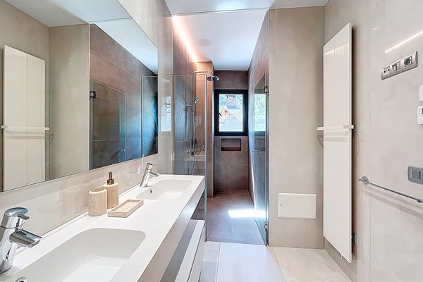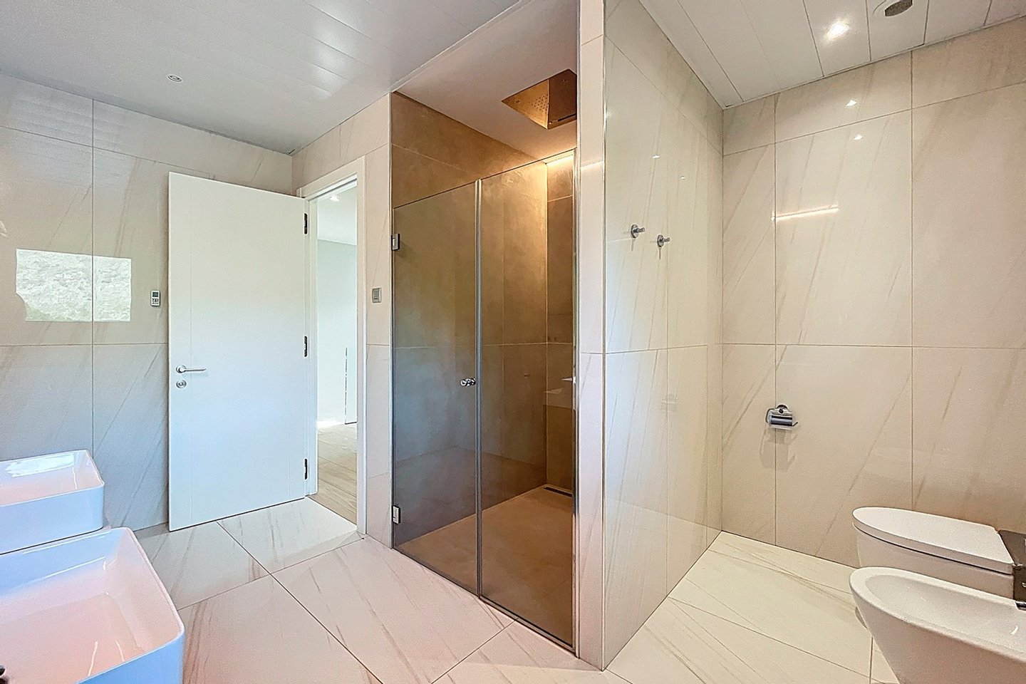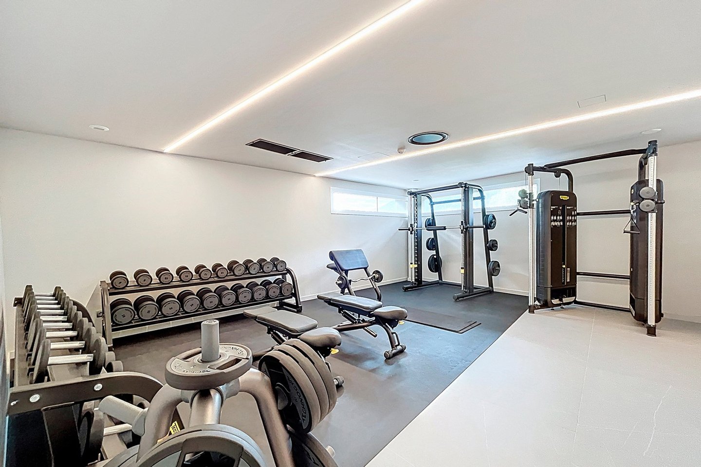 Unterhalb der Wohnebenen, im Keller -1, gibt es einen Waschraum mit einer 8 m² großen Außenterrasse, ein großzügiges 135 m² großes Fitnessstudio mit Vorinstallation für einen Pool (der bei Wunsch erweitert werden kann) sowie einen angrenzenden Raum für eine Sauna, Hammam oder andere Wellnessbereiche. Es verfügt außerdem über eine Zone mit vier Waschbecken. Außerdem gibt es ein 45 m² großes Solarium, das über eine Außentreppe zugänglich ist, ideal zum Entspannen und zum Genießen von ruhigen Momenten.