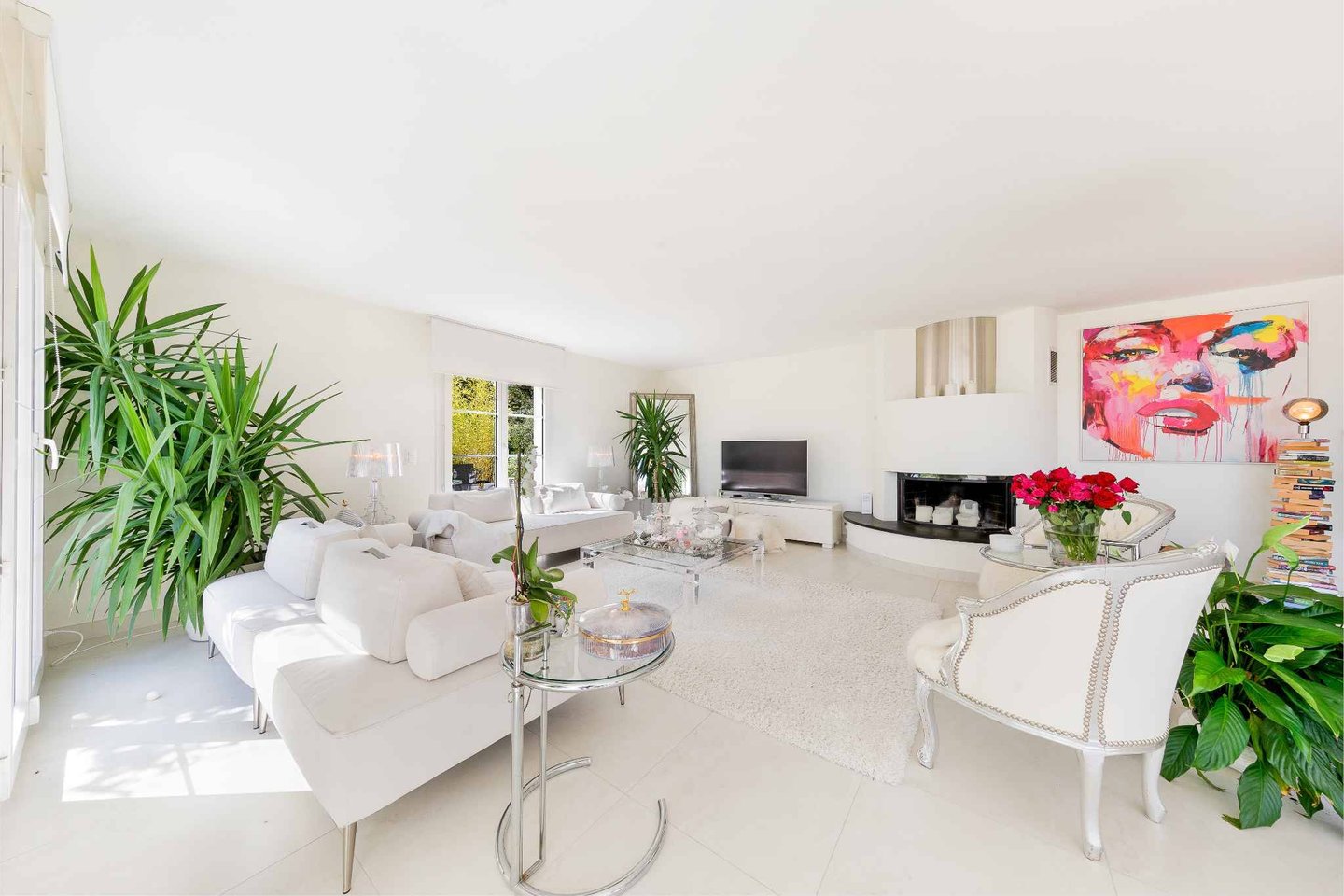 Großes, helles Wohnzimmer mit Kamin, direktem Zugang zur Terrasse und zum Pool