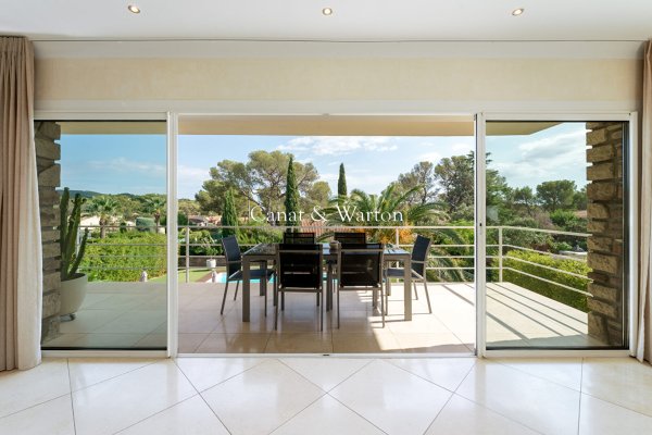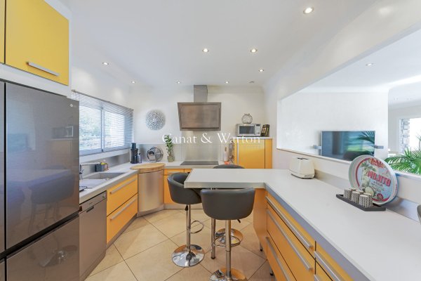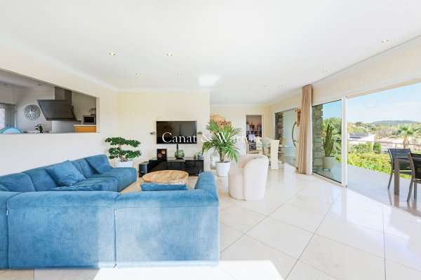 Entdecken Sie in der privilegierten Umgebung von Booulouris diese komplett renovierte Villa, die Helligkeit, Komfort und Raffinesse vereint. Auf der Hauptebene öffnet sich ein großes Wohnzimmer mit offener Küche auf eine schöne Terrasse mit Blick auf