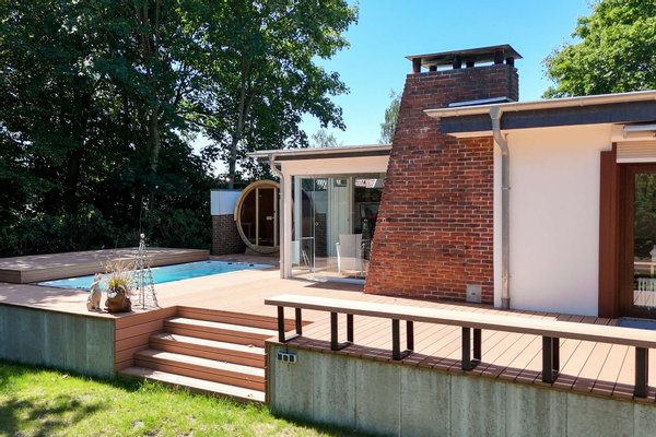 Das Herzstück des Außenbereichs ist der malerische rund 7.000 m² große See. Ob ein erfrischendes Bad im Wasser, inspirierende Stunden im idyllischen Seehaus oder ein Glas Wein bei Sonnenuntergang am Ufer – hier kommt die Seele zur Ruhe. Begleitet wird das Naturerlebnis von einer privaten Wellness-Oase: Ein sprudelnder Swimspa unter freiem Himmel, eine urige Fasssauna und eine großzügige Terrasse mit Weitblick ins Grüne laden zum Entspannen und Genießen ein.