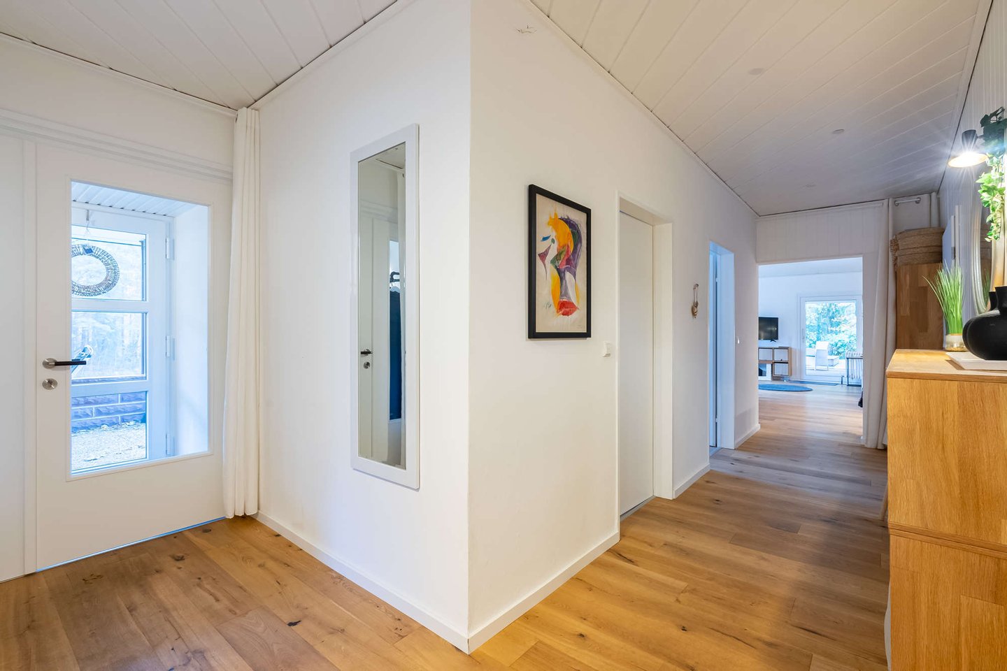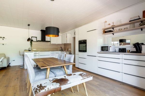 Das Wohnhaus selbst vereint Komfort und behaglichen Charme. Im offenen Wohn- und Essbereich mit Küche trifft Gemütlichkeit auf Weite. Große Fensterfronten schenken lichtdurchflutete Räume und eröffnen einen atemberaubenden Blick über den See – Natur wird hier zum Teil des Wohnens. Zwei ruhige Schlafzimmer, ein zusätzliches Arbeits- oder Gästezimmer, ein helles Bad sowie ein separates Gäste-WC bieten Komfort für die ganze Familie. Der lichtdurchflutete Wintergarten schafft einen weiteren naturnahen Rückzugsort. Ergänzt wird das Raumangebot durch mehrere großzügige und praktische Kellerräume. Auf dieser Ebene finden Sie ebenfalls die Garage, welche neben der Scheune und dem Hof ausreichend PKW Stellplätze bietet.