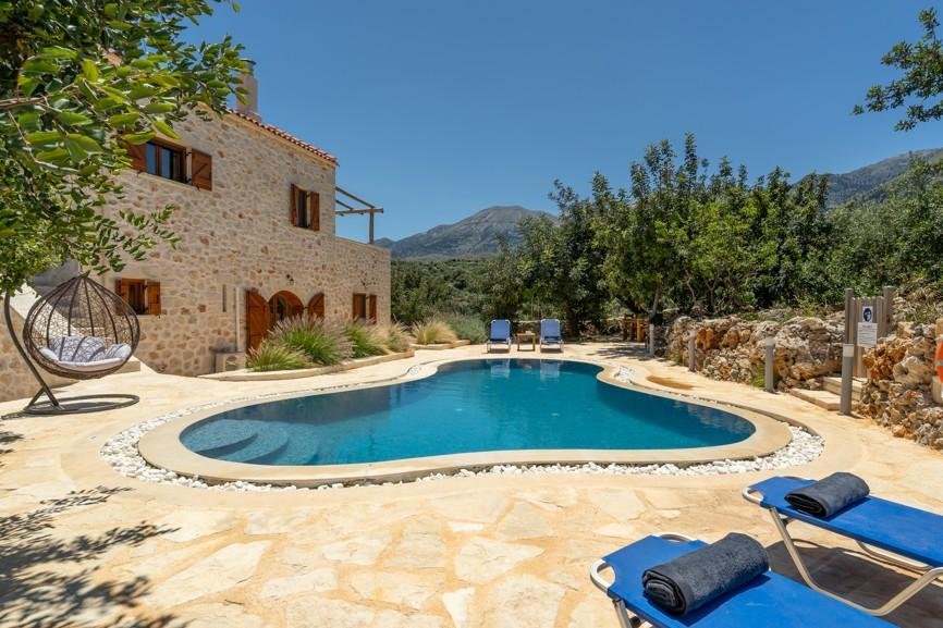 Das neu erbaute Haus fügt sich nahtlos in die ländliche Umgebung ein und verfügt über private Außenbereiche und einen eigenen Swimmingpool. Im Erdgeschoss befinden sich zwei Schlafzimmer mit eigenem Bad – eines mit Doppelbett, das andere mit zwei Einzelbetten – beide mit direktem Zugang zum Garten und Poolbereich. Im Obergeschoss vereint der offene Wohnbereich eine Einbauküche, einen Essbereich und ein Wohnzimmer mit Zugang zu einem Balkon mit Blick auf die Weißen Berge und Blick auf das Meer in Richtung Rethymno.