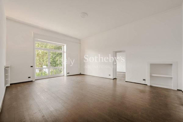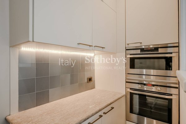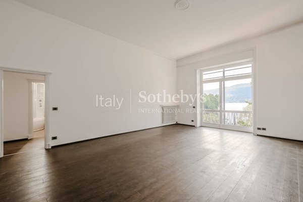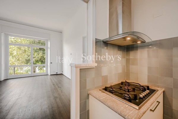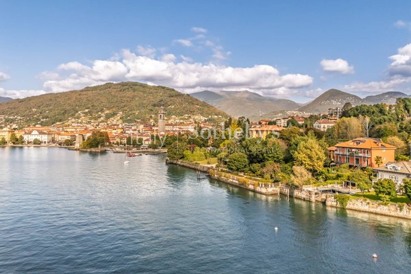 Der Wohnbereich wird durch einen eleganten Essbereich fortgesetzt, der den Blick auf den See und die Insel San Giovanni freigibt und direkten Zugang zur Terrasse bietet. Angrenzend befindet sich eine offene, voll ausgestattete Küche, perfekt für alle, die das Leben im Haus gesellig und harmonisch gestalten möchten. Die Residenz umfasst zwei Schlafzimmer mit bezauberndem Seeblick, zwei stilvoll ausgestattete Badezimmer sowie ein drittes vielseitig nutzbares Zimmer, ideal als Büro oder zusätzliches Schlafzimmer, mit eigenem Eingang von der eleganten historischen Villa.
